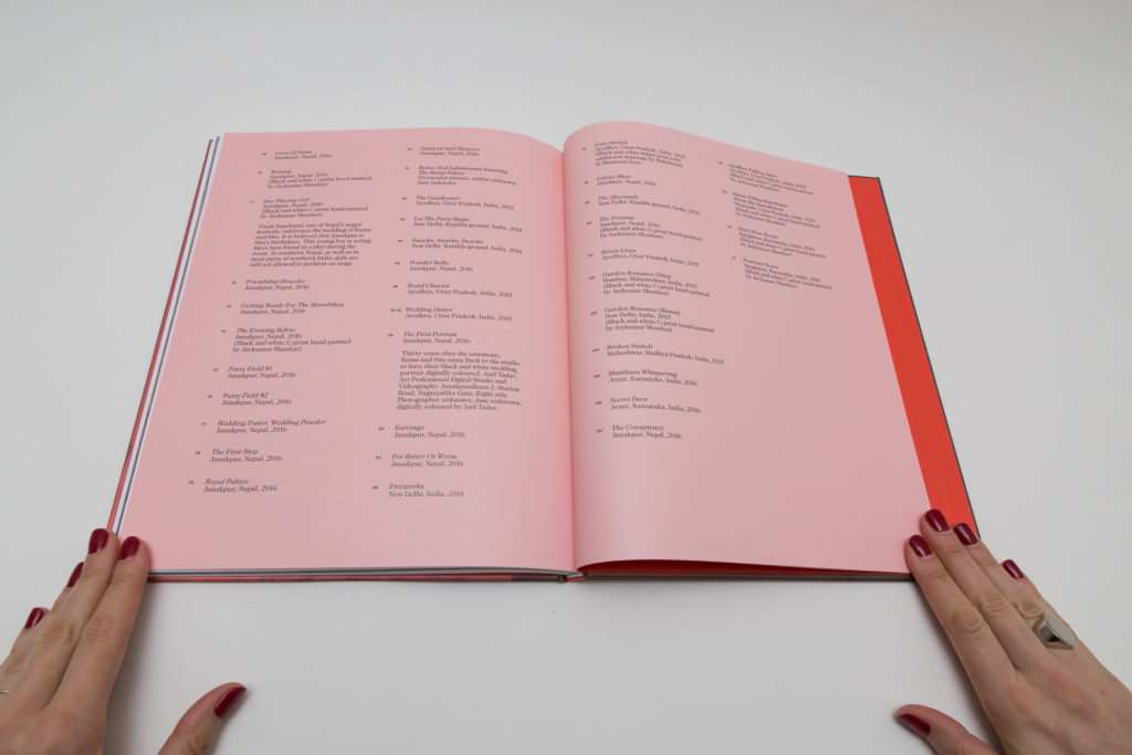 As a photobook, The Promise has an elegant design, an elaborate concept and excellent print quality. Its cover immediately grabs attention: an old-fashioned wedding portrait of Rama and Sita appears in full bleed with a red shimmer. The book omits page numbers but thoughtfully numbers the images picking up from the first book, symbolically marking the continuation of the narrative. The layout plays an essential role in building the dynamic. The main text (rewritten by Arshia Sattar) appears throughout the book in light pink, placing the images specifically inside the existing plot of the Ramayana.