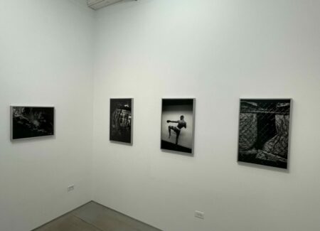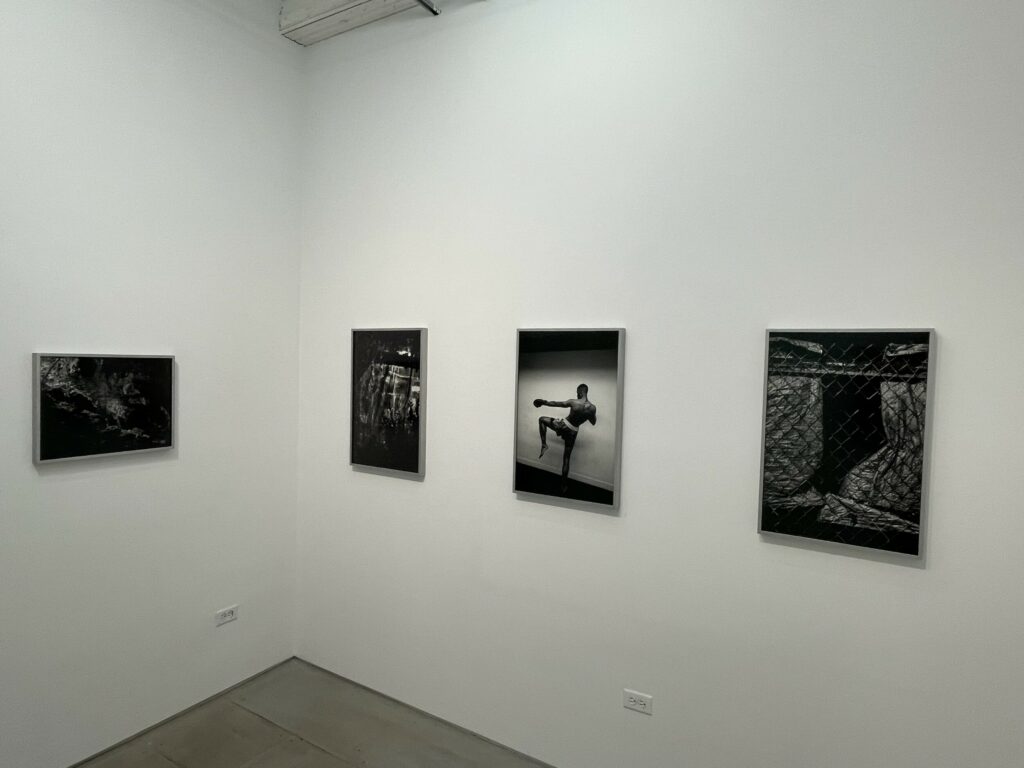 The only two photographs in the show that might be called portraits capture a man named John shadowboxing against a blank wall. Pérez is a boxer themself, and their choice of poses highlights a mix of power and vulnerability. One image finds John covering up with his gloved hands, with sweat beaded on his bare back; in the other, he stretches out with one leg bent, seemingly about to kick, his arm extended and his body open. The two could easily be hung as a diptych, the opposing forces and instincts balancing each other.