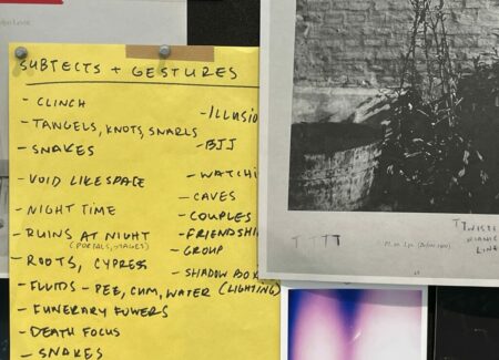 Pérez then leverages the boxing motif one step further, using black padded mats (from the gym) as the substrate for a set of three large scale collaged works, each of which includes a variant image from the boxing shoot in a prominent location. Each work is an assemblage of prints in various sizes (in both black-and-white and color), found imagery, book plates, images of text pages with underlining, and gatherings of lists and note pages (both printed and hand-written). More than mood boards but less than structured arguments, these works follow along as Pérez makes formal and visual connections, tries out combinations, and generally thinks things through, the richness of their ideas coming through strongly. In particular, the texts and note pages allow us to loosely follow their train of thought, the surrounding imagery reinforcing themes and motifs they are exploring. Cracks and dark lines seem to anchor two of the assemblages, while the third mixes florals with bodies and voids, the intermittent text monologue peppered with questions and impulses and the nearby imagery filling out checklists of subjects and gestures. The result is something akin to layered stream of consciousness, where the work of the mind is directed and intentional, while still being artistically open-ended and searching. These assemblages recall Lyle Ashton Harris’s studio wall collages, but with even more intimate windows into Pérez’s churn through conceptual and aesthetic possibilities.
