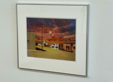 Many more of Calla Watson’s works push her interventions into the realm of fantasy, having playful fun with the different ways Barrett’s visage can be shoehorned into an existing composition. She adds Barrett’s face and silhouette as a water stain on the driveway (in an Albuquerque image by Joe Deal), as a thin shadow in the street (in a Minnesota view by Frank Gohlke), as scrapings in the dirt (in another Albuquerque picture by Deal), and as a pruned bush (in a Route 66 motel scene by Schott). She then goes further, adding Barrett’s face to the clouds, the sun, and the sky above images by Robert Adams and Shore; in some cases, the supermodel is benevolently smiling, and in others, he is staring open mouthed and blank eyed as though angry or possessed, his hovering omnipresence almost God-like.