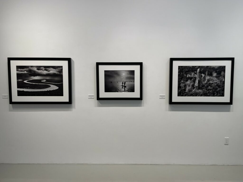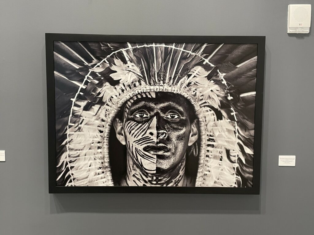 At the other end of the scale and grandeur spectrum are much more intimate portraits of indigenous peoples and their various daily rituals, as seen from close up. Salgado spent time with the Yanomami, the Yawanawá, and the Zo’é, among others, building up enough trust to be allowed to be present at everyday events like fishing, bathing, and simply resting, in addition to special occasions and rites of passage when decorative clothing and body paint were in use. A massive print of a marching line of warriors dominates one wall (over the reception desk), but many more of the images of daily life are less imposing. A pair of silhouetted figures paddle along at daybreak, a young woman bathes in an edenic stream, and families fish in canoes underneath the backdrop and overhang of the enveloping forest. Salgado also brought along a makeshift studio setup, where he made isolated portraits against black linen. His portraits, several of which are installed along a dark grey wall, are unexpectedly beautiful, almost disconcertingly so, with penetrating stares doused in dark makeup and elaborate feathered headdresses surrounding intricately painted faces. Of course, some of these pictures edge towards a “noble savage” trope, but again, the strongest pictures of people resist the urge to make the images unusually dramatic, leaving some mystery and magic in the gestures and shadows.