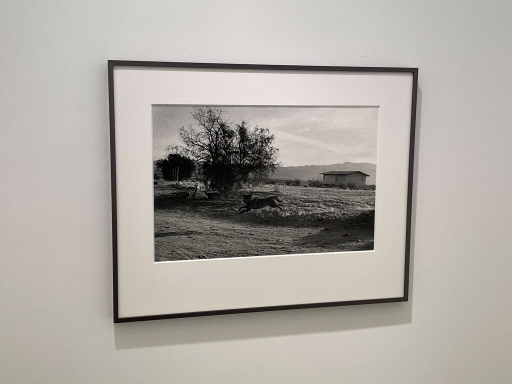Sometimes potential photographic projects present themselves in unexpected ways, and while Divola was out driving around in his car and scouting houses in the desert, he would often encounter dogs that would run out to bark at him and then chase his car down the dirt roads. As the dogs ran alongside his moving car, he used a motorized 35mm camera to make blasts of exposures out the window. His results turn the dogs into frozen black silhouettes flying through the air, their speed halted for just an instant, like Edweard Muybridge’s 19th century stop motion studies.