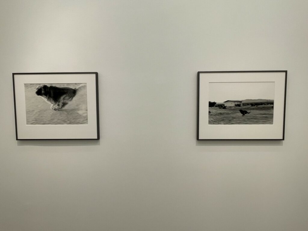 There is something durably magnetic about these seemingly simple pictures. As I was standing in the small gallery space, two young men who had never seen the photographs before came in and were mesmerized by what they saw, the elemental forms of the blurred dogs in motion at once vaguely comic, a bit futile (they never catch the car of course), and powerfully animal and real. Photographically, the contrasts of light and dark give the pictures undeniably boldness, and the conceptual underlayers of the man/dog chase and its meanings add richness to how we might interpret the scenes.