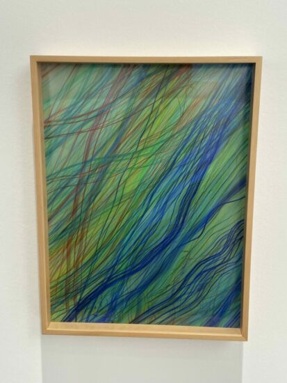 Galeria Filomena Soares (here): Thin strands of wavy color rush across the surface of this 2021 abstraction by Edgar Martins. Threads of cast light provide the subject matter, each line seeming to wander and unravel with wispy ephemerality. The density of the overlapping fibers creates a sense of energetic motion, with each loose gesture creating its own quivering pathway across the space of the frame. Priced at €5500.