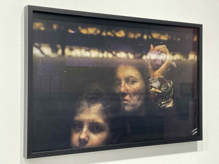 ºCLAIRbyKahn (here): This haunting photograph was made by Chien-Chi Chang at the train station in Lviv just after the start of the war in Ukraine, when families were separating, with men heading off to fight and women and children fleeing to Poland and elsewhere. The window of the train provides a physical barrier, with the reflections and misted water droplets further distorting the silent communication. The glances in the image mix vulnerability and powerful resistance with a rumble of quiet dead-eyed determination. Priced at €7000.