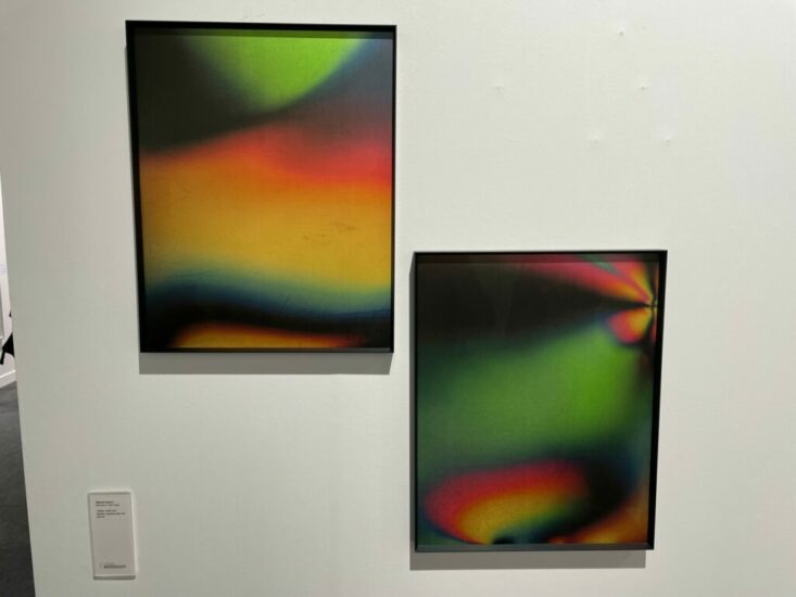 Galerie Esther Woerdehoff (here): Given their innovative use of gold leaf in combination with delicately textured Japanese papers, the artist duo of Abarrán Cabrera have developed a photographic color palette with a uniquely rich glow. In these abstractions from 2022, the color sifts into gradients that bend and flow, washing into rainbows of saturated fades and curves. Priced at €4600 each.