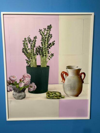 Huxley-Parlour Gallery (here): This booth was a solo presentation of new works by Daniel Gordon, backed by bold wallpaper and a new monograph. The new pictures continue to explore Gordon’s signature approaches to image-based paper construction, further refining his still life arrangements and stylized silhouette portraiture. In this work, the bolder colors and more intense shadow motifs of earlier efforts have been softened and pared back, building up visual mysteries and contradictions with the simpler forms of doubled jugs and flattened leaves. Priced at €16450.