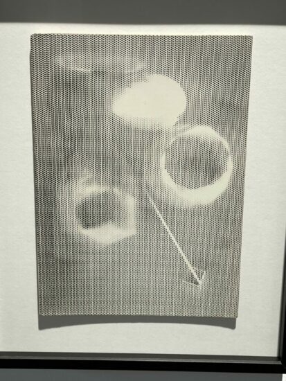 Les Douches la Galerie (here): While most of Man Ray’s photograms were arrangements of objects against the blackness of full exposure, in this 1922 work a perforated mesh interrupts that darkness, creating a softer dotted surface. Bright whiteness then interrupts the uniformity of the pattern, introducing vaguely geometric ghosts that hover and dissolve. Priced at €25000.