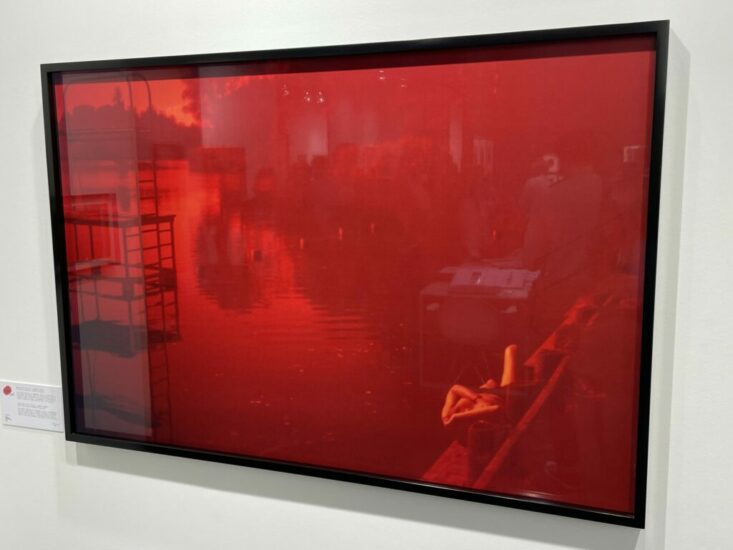 Bildhalle (here): A thick red tint envelops this quiet lakeside scene by Simone Kappeler, giving it a sense of sultry heat and stylized stillness. The surface of the water is rippled like antique glass, and the warmth of the day seems to wash over the empty swimming area, leaving the lone sunbather to relax in the silence. This photograph feels like an exercise in atmosphere, where setting is transformed into mood. Priced at €16000.