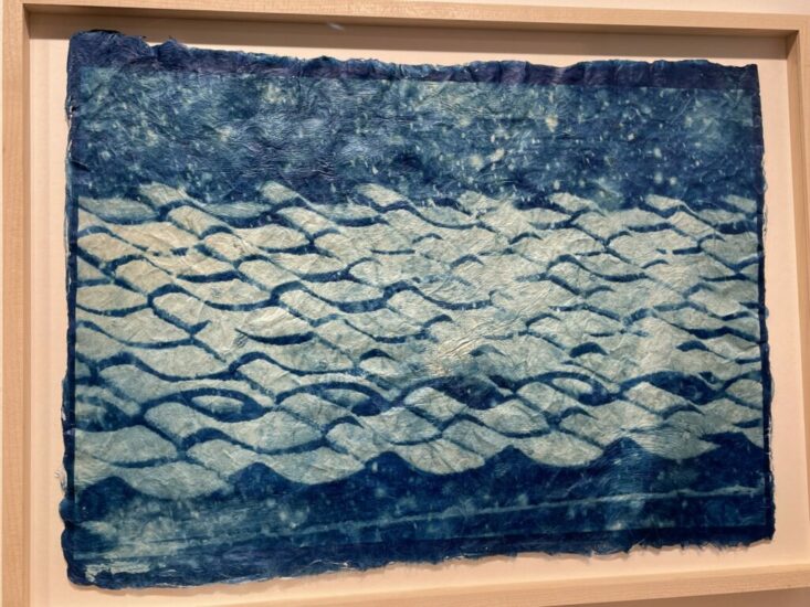 IBASHO (here): The Japanese gampi paper used in this recent work by Mika Horie is naturally rippled and textured, making it an elegant substrate for an abstracted cyanotype of water. The wave-like forms march across the surface, with droplets and mists thrown into the areas of darker blue. The result is simple but satisfying, pulling abstraction back toward allusively graphic representation. Priced at €1650.