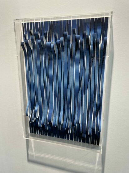 Galerie Anita Beckers (here)/Galerie Kornfeld (here): This 2022 work from Christiane Feser finds her playing with loops and billows, seemingly turning a striped image back on itself. The disorienting undulations of the rephotographed image and the physical cut paper confound our sense of depth, with waves that move up and down and highlights of edges that never quite align in the ways we might have expected. Priced at €7700.