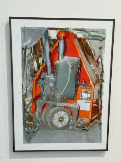 Sentiment (here): The expressive melting quality in this image by Jean-Vincent Simonet was made by printing on plastic coated paper and overinking the print, leaving the image wet for longer than normal. Simonet could then intervene, creating blurs, washes, dissolves, and other painterly effects. The larger series captures the machinery in his family’s print factory, thereby mixing history and memory with deliberate process disruption. Priced at €1900.