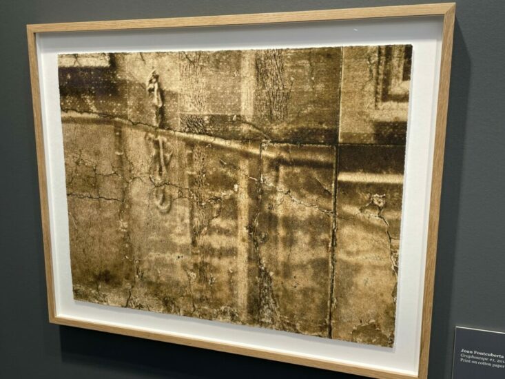 Fondation des Amis du Musée du Prado: This crackled and sepia-toned image was made by Joan Fontcuberta using the Prado as his ostensible subject. He began with a 19th century panorama of the interior of the museum’s central gallery displayed with a rotating device called a graphoscope, and then enlarged a tiny fragment of that larger image. His composition mixes the fragment of a wall (two corners of framed paintings can be seen near the edges) with the deterioration of the original print itself, the surface becoming gloriously tactile, and making it difficult to untangle actual history from the concepts of preservation and decay.