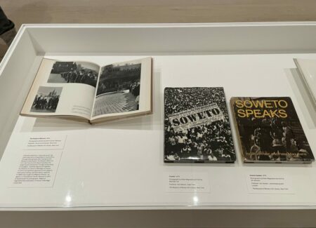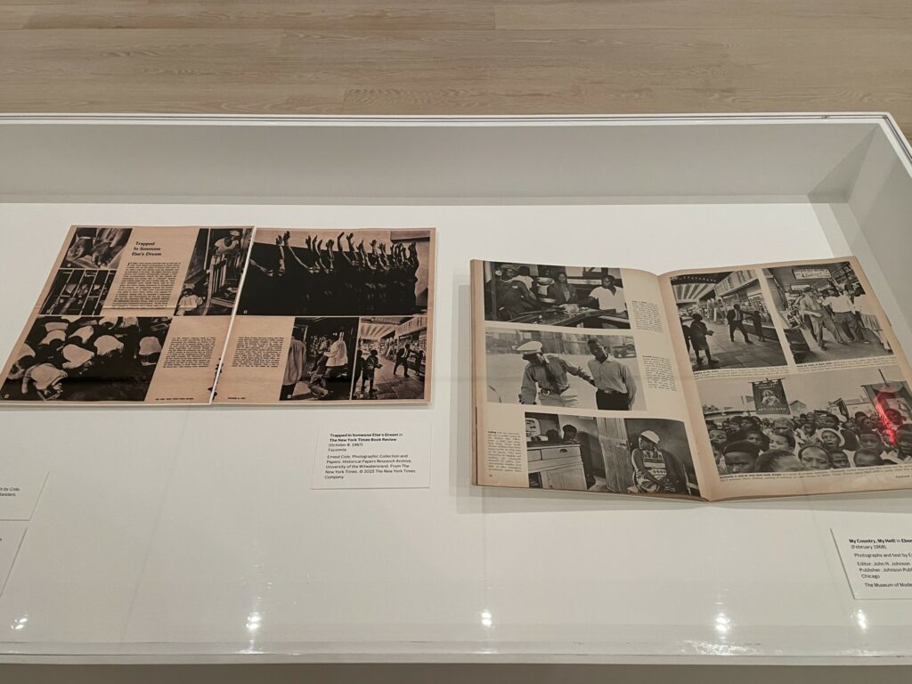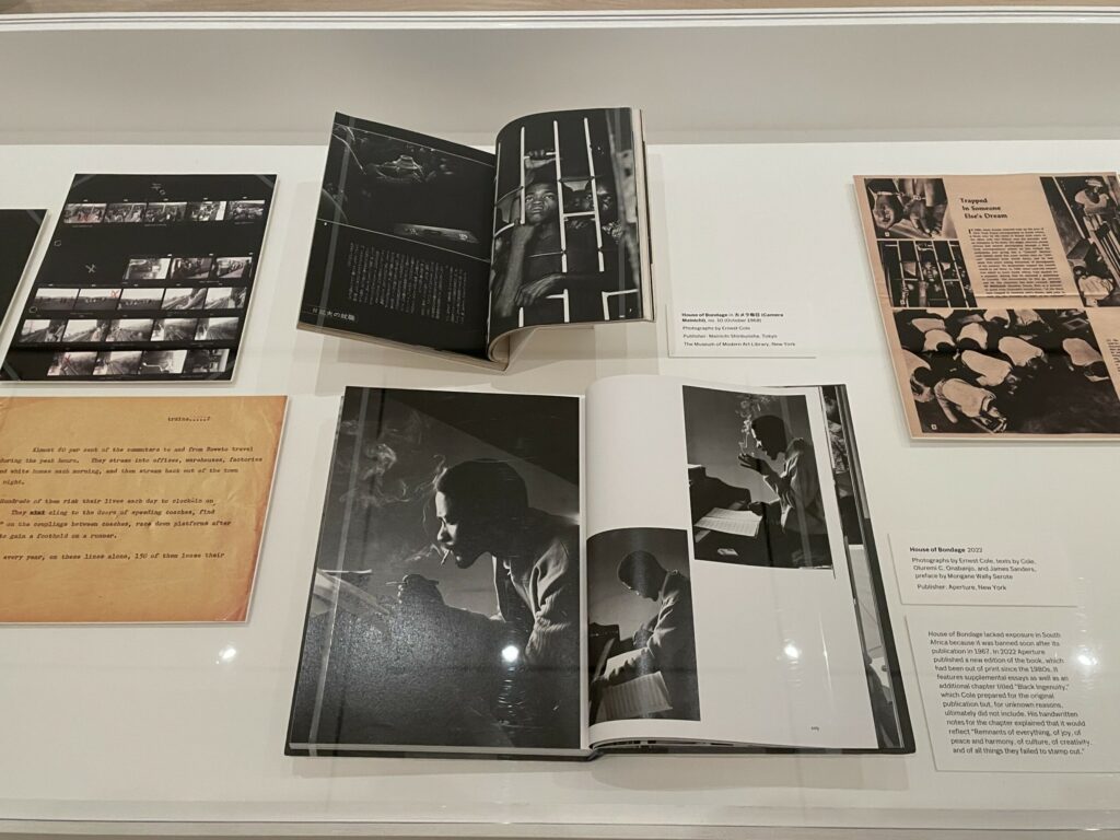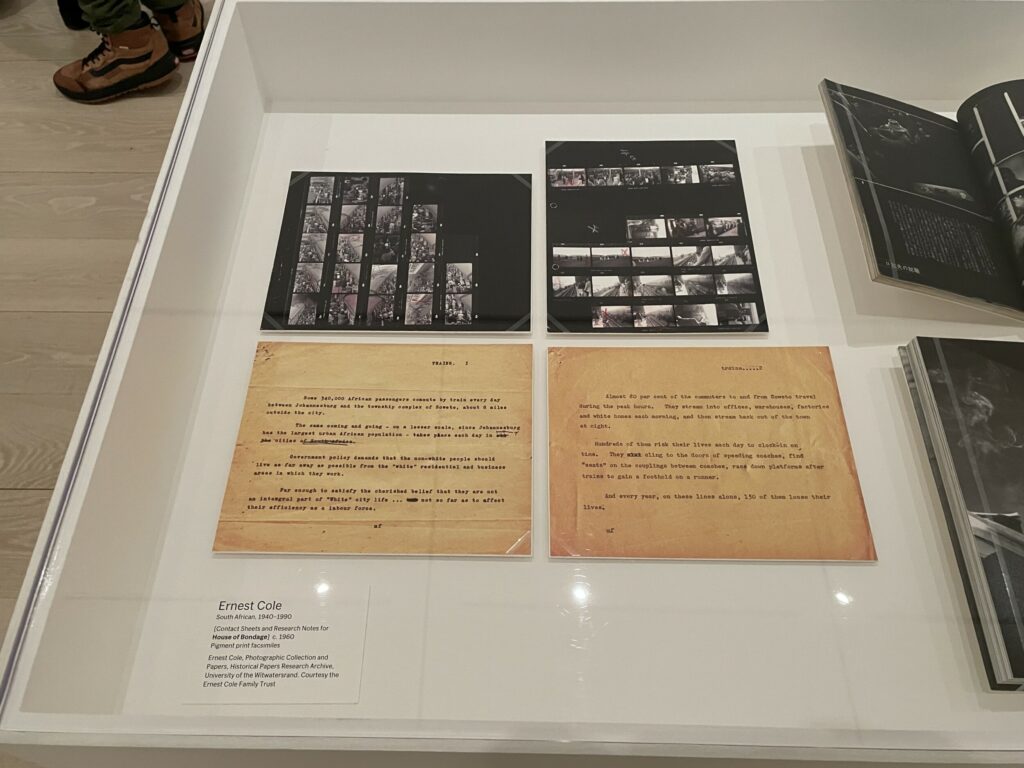 Stepping back from this main wall, the rest of the contents of room 409 have been included to provide context for the main installation of photographs. A pair of vitrines contains Cole’s influences (a photobook by Henri Cartier-Bresson), a few of his contact sheets and captions, books by his contemporaries in South Africa (Peter Magubane and David Goldblatt), and a few magazine spreads featuring Cole’s images. Nearby walls add a handful of prints of similar subject matter by Goldblatt, some 1970s era works by Jeanne Moutoussamy-Ashe and Gavin Jantses (both of whom took Cole’s photographs as inspiration), and a range of images Cole made in the early 1970s in New York on a grant from the Ford Foundation. All of this is secondary supporting material, but in theory it fills out the picture of what, how, and why Cole was doing what he was, and where it begins to fit in the larger arc of art responding to Black lives. That said, Cole’s photographs from House of Bondage don’t really need this packaging; the photographs (and text captions) can certainly speak (or shout) for themselves.