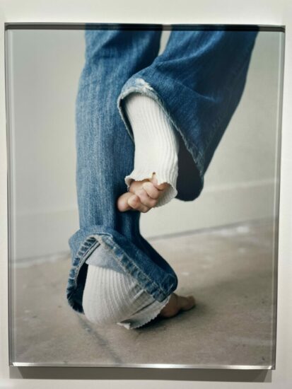 Webber Gallery (here): Gently curled toes provide a tender foil to the precisely observed textures of denim and ribbed white cotton in this 2023 image by the Swiss photographer Senta Simond. The pose has the sense of an understated reveal, like a protective pulling in glimpsed only fleetingly. Priced at €7500.