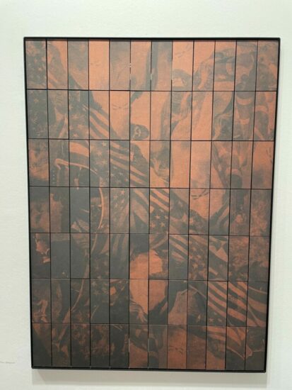 Webber Gallery (here): Fragmented flags tumble and burn in this gridded work by the British artist Theo Simpson. Drawing imagery from various protests, riots, and the January 6th attack on the Capitol, the collaged work simmers with chaotic tinted impressions arranged with rigor, the screen printed rectangles backed by a rolled steel chassis. Priced at €22000.