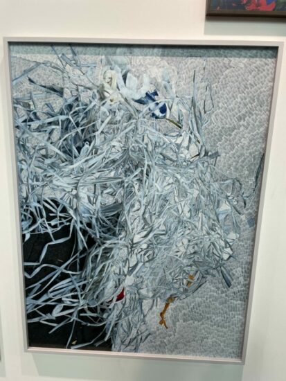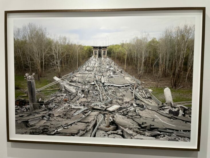 Alexander Levy Gallery (here): Photographic documentation of the war in Ukraine wasn’t as prominent at this year’s fair as I might have expected, so this striking image by Fabian Knecht of the collapsed Desna River bridge certainly stood out. Knecht is likely best known for his white cube isolations built in nature, but this picture is seen with a similar kind of strictness of construction, with nature divided by a strip of rubble and rebar. Priced at €9800.