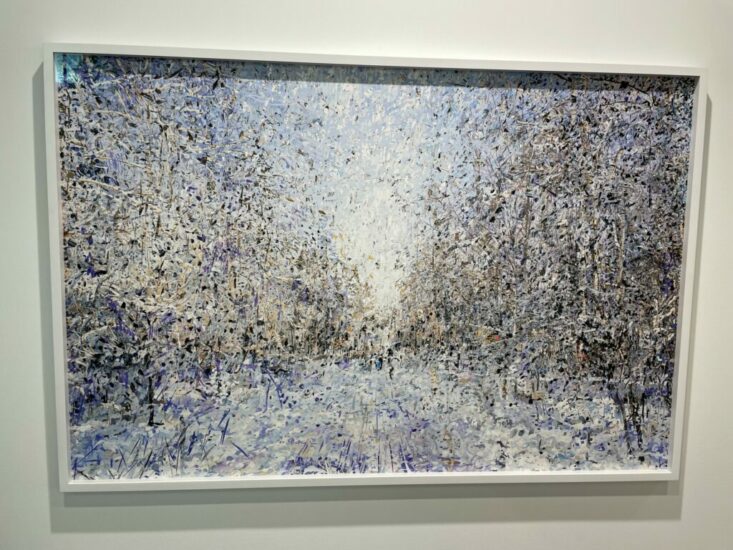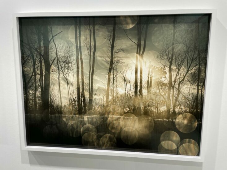 Persons Projects (here): This 2023 image by the Finnish photographer Eeva Karhu turns a large scale winter scene into a blizzard of digital collage. Her single composition superimposes an entire season of images into one frame, collapsing months of time into an instant. Up close, the work is dazzlingly dense with impressionistic fragments and marks, a winter pathway through the trees seen breaking down into fluttering sparks of color. Priced at €9500.