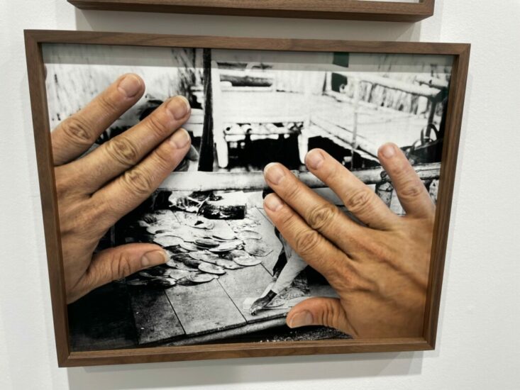 Ryan Lee Gallery (here): This 2023 print comes from Stephanie Syjuco’s series “Block Out the Sun” which originally took form as a video installation and image stills. The artist’s hands interrupt archival photographic documentation of a Filipino village re-created for the 1904 World’s Fair, preventing us from consuming the ethnographic imagery and upending the stereotypes such imagery continues to represent. Priced at $8000.