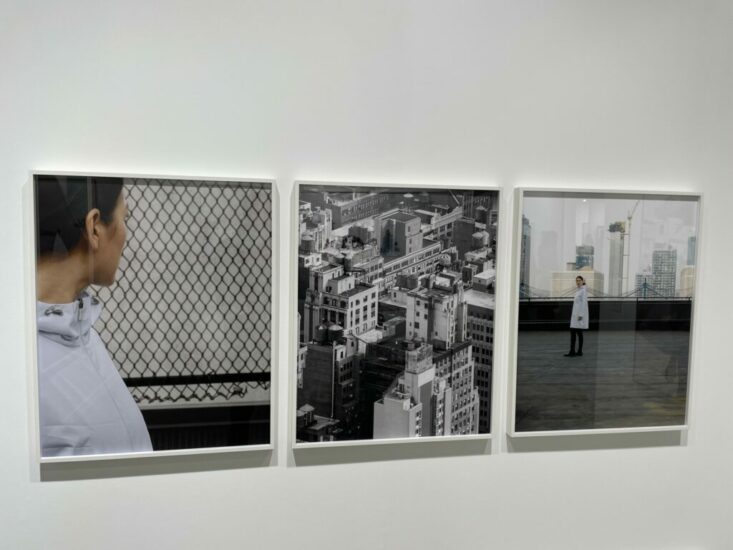 Kuckei + Kuckei (here): Even after more than two decades of work, Barbara Probst’s multi-camera synchronicities continue to feel fresh and unexpected. In this New York City rooftop scene from 2023, we seem to follow the model’s eyes in opposite directions, with the bird’s eye view capturing a tiny self-portrait of the artist at work. The spatial dynamics in Probst’s works are complex and sophisticated, like single moment visual puzzles that can be solved again and again. Priced at €24000.