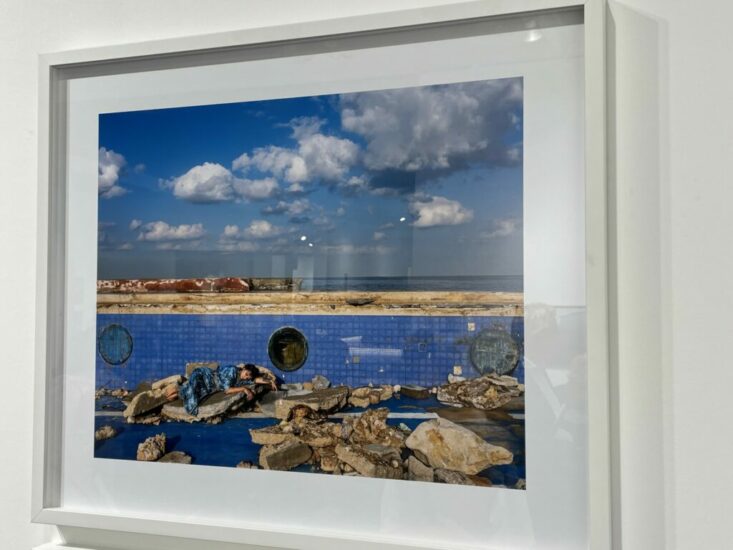 Galerie Tanit (here): Glamour and destruction intersect in this recent image by Rania Matar. Made in a dry swimming pool at a Long Beach resort in Beirut destroyed during the ongoing Lebanese civil war, the deep blue tilework is matched by the scattered rubble, with the woman’s calm presence perhaps offering a sense of resilience and healing. Priced at €5000.
