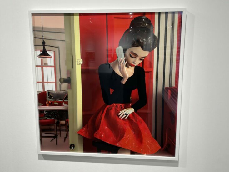 Louise Alexander (here)/Fellowship (here): While this new work by Laurie Simmons is certainly aesthetically reminiscent of her previous photographic efforts with dolls, domestic settings, and carefully staged interiors, this image was made not with a camera but with the text-to-image AI tool DALL-E. The modeled skirt and hair of the woman seem almost like a digital version of papier-mâché, while other features and details in the picture have the eerie smoothness and strange incomprehensibility we have come to associate with AI. Priced at €9000.