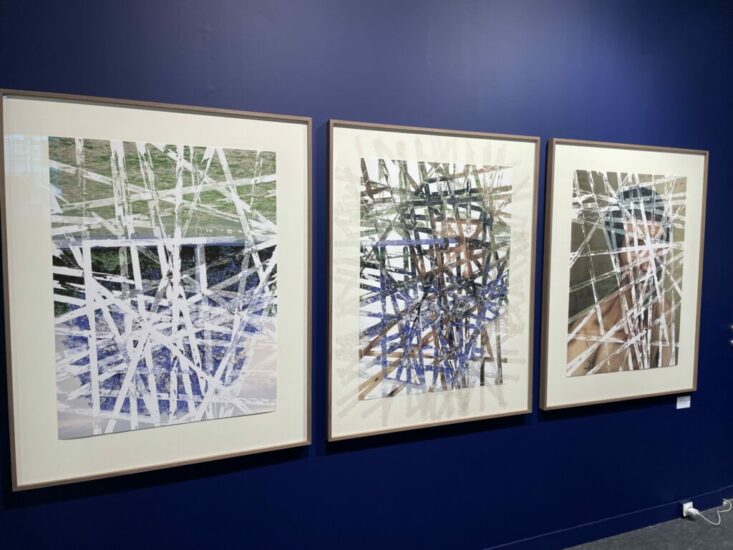 Magnum Gallery (here): This 2023 triptych by the South African photographer Mikhael Subotzky used transparent strips of tape to deconstruct and reconstruct a pair of images. Photographs of an upside down jacaranda tree and a man named Hermanus flank the central image, which is built from parts of each of its neighbors, weaving man and nature together like a basket. The process is innovatively unexpected, with compelling aesthetic possibilities for merging images. Priced at €64100.