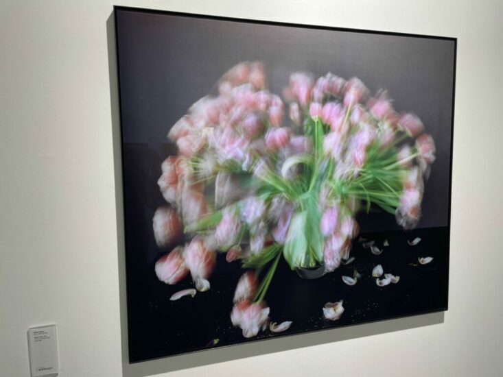 Galerie Esther Woerdehoff (here): Michael Wesely has consistently been interested in the possibilities of long duration photographic exposures, with some of his city and architectural images capturing the passing action over an entire year. His still lifes of bouquets of tulips, like this image from 2022, are done with relatively shorter exposures of just a week, the stems slowly drooping and the petals falling as the days pass. The resulting blurred images document the entire process, creating a graceful sense of motion. Priced at €15000.