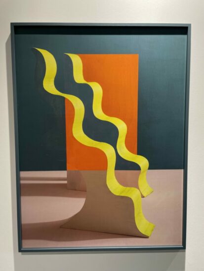 Ncontemporary (here): Erin O’Keefe’s tabletop still lifes always feature an element of inspired visual illusionism, but this new work has a particular flair for pleasing confusion. Up close, some of the artist’s painting trickery can be seen, but from a few steps back, the flattening eye of the camera collapses the distance and erases the surfaces, creating the appearance of yellow ribbons floating in space. Priced at €17000.