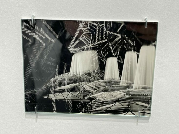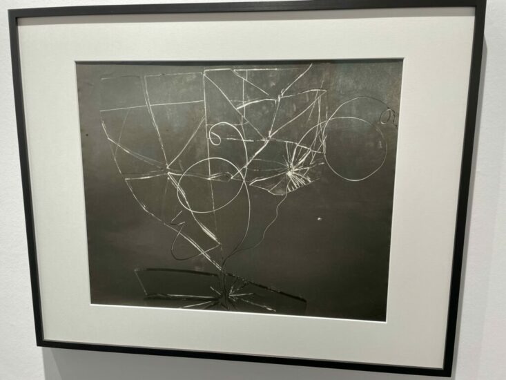 MEM (here): Straight and curved struggle for dominance in this near abstraction by Yushi Kobayashi. Both the cracks in the glass and the bends of the wire function like mark making, with bright lines dancing and intersecting across the floating composition. Priced at €16000.