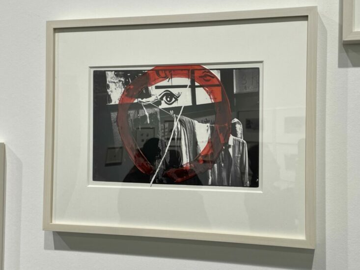 Yumiko Chiba Associates (here): Kazuo Kitai has recently been experimenting with overpainting, adding bold gestural painted marks on top of his earlier photographs (in a manner not dissimilar to what William Klein did a few years ago). This 1964 image has been amplified by a brash red circle, centering our attention on the eye and the clothesline in the picture. The original painted images have then been re-imagined as ink printed editions, complete with bumpy three dimensionality. Priced at €1200.