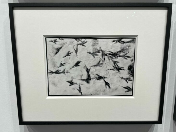 Michael Hoppen Gallery (here): Vintage prints from Masahisa Fukase’s now classic photobook The Solitude of Ravens are deservedly sought after, the haunting images of swarming black birds in murky grey skies creating an indelibly dark mood. This 1973 image from the series is less direct and recognizable, offering a downward view of scratchy raven footprints in the snow. From afar, the angled footprints dissolve into all-over abstract marks, almost like calligraphy. Priced at €32000.