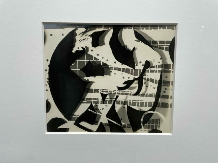 Michael Hoppen Gallery (here): This 1950 photogram by Ei-Q (aka Hideo Sugita) mixes surreal cutout bodies and abstract patterns into something vaguely reminiscent of the silhouetted decorations found on a Greek amphora. Ei-Q called his photograms “photo-dessins”, amplifying the ideas of drawing with light and incorporating the chance effects produced in the darkroom. Here the figures intertwine within the circle, interrupted by stripes of mesh. Priced at €28500.
