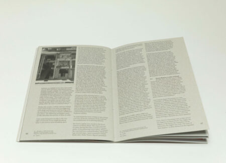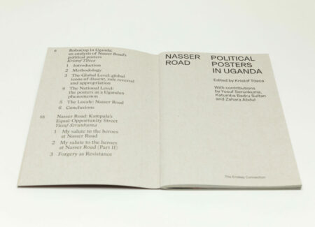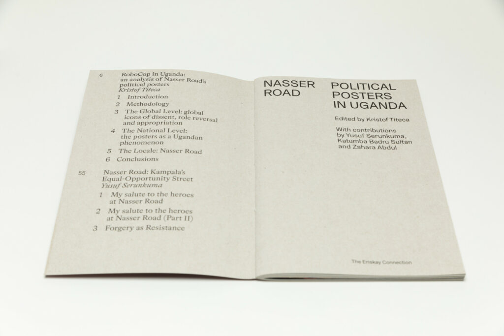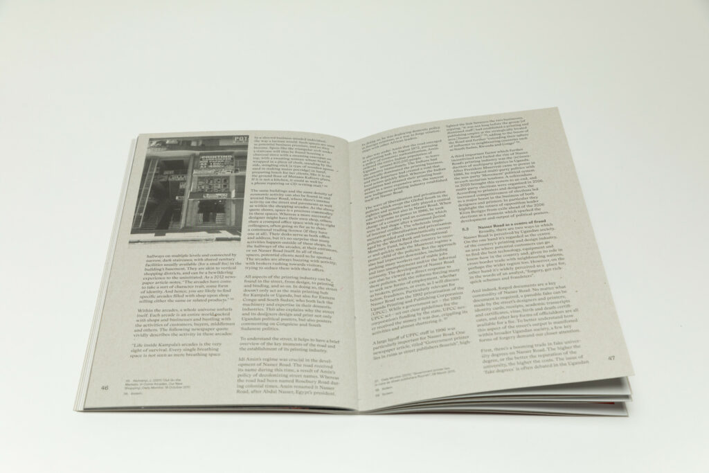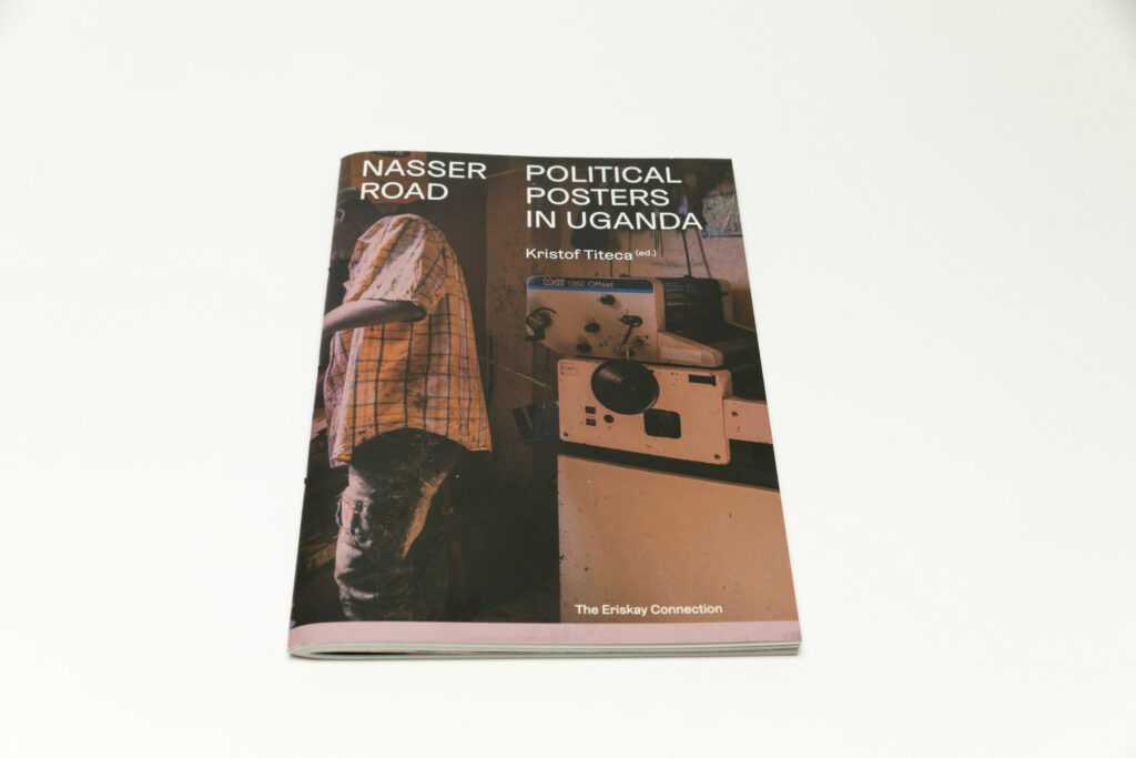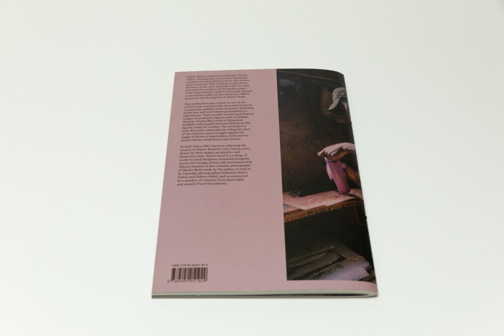 Nasser Road is a slim softcover book with a strong vertical orientation, with its title placed at the very top in two columns. A photograph of a man at work in a print room appears in the background. The book is printed using the same cardstock as the actual Nasser Road posters, glossy on one side and uncoated on the other. As a result, the poster reproductions in the book are printed on the glossy side and the essay that runs through the book on the uncoated side. The middle section includes photographs by Titeca and the Ugandan photographers Badru Katumba and Zahara Abdul, and is printed full bleed on a lighter paper.