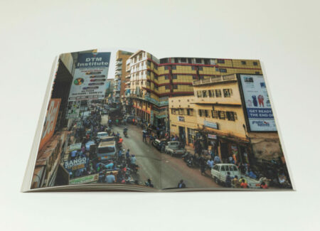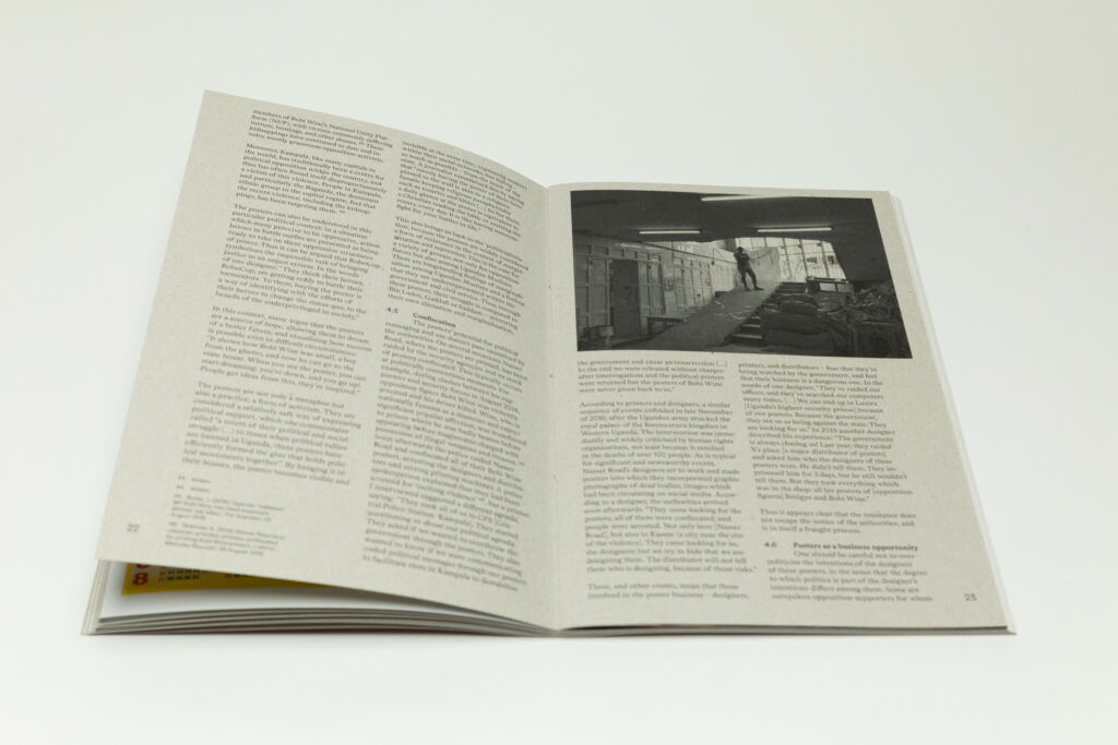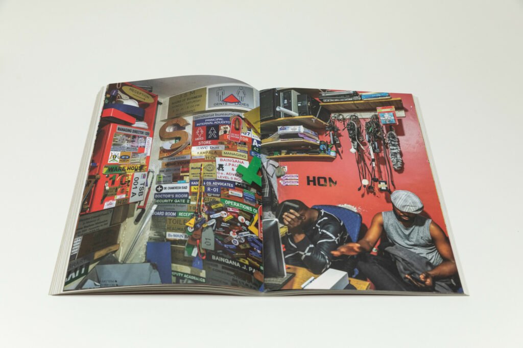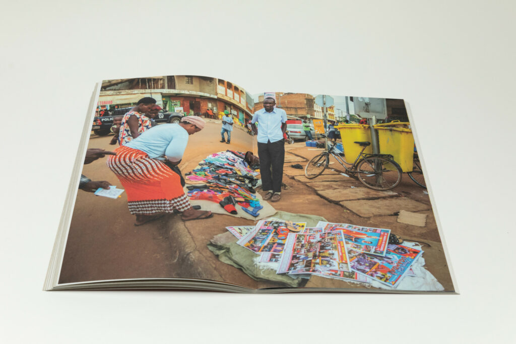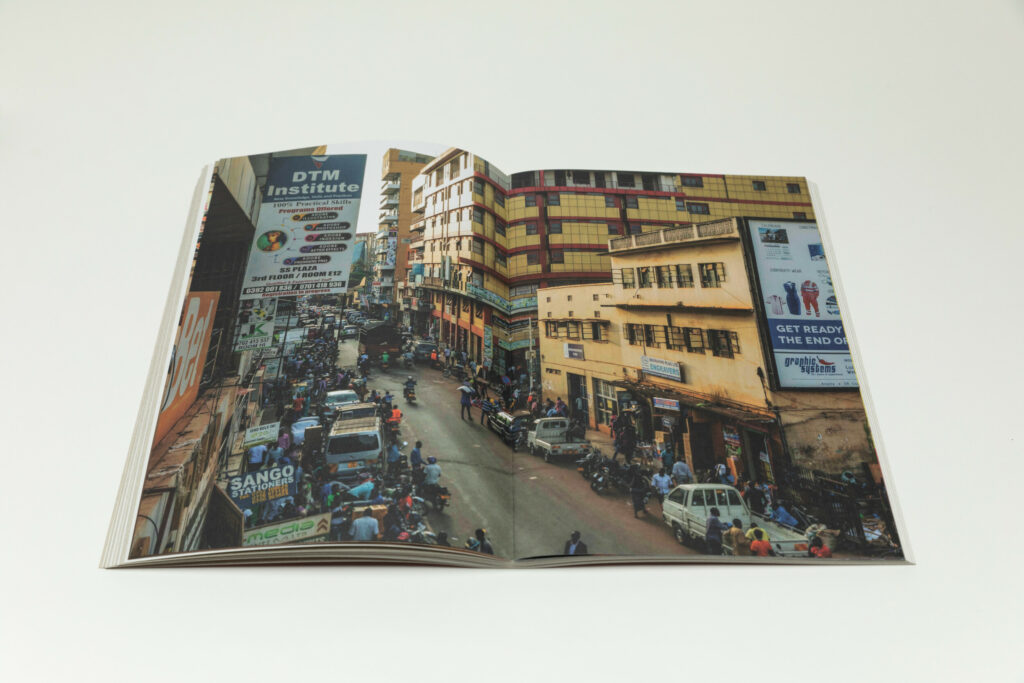 The middle section of the book provides insights into the life and energy of Nasser Road itself. A full bleed photograph shows a man on the street walking around with a stack of posters. A couple of images take us inside a design studio, where the walls are covered with various signs and posters, and people work at the desks, their faces concealed. One shot captures a room with a stack of posters, while a man displays one reading “FREE UGANDA”.
