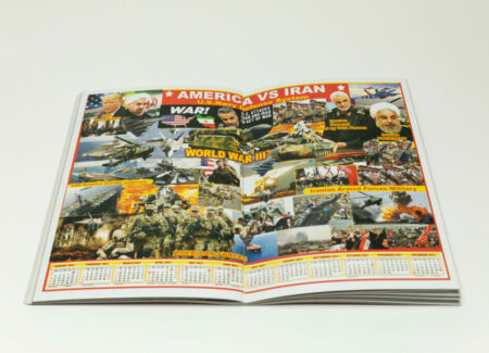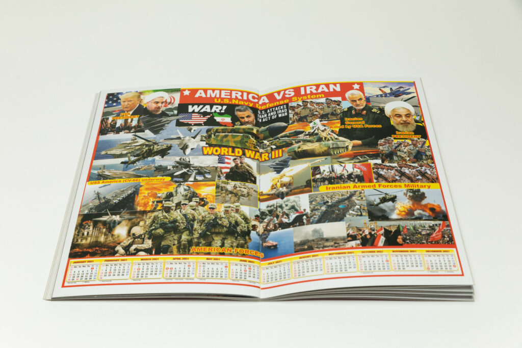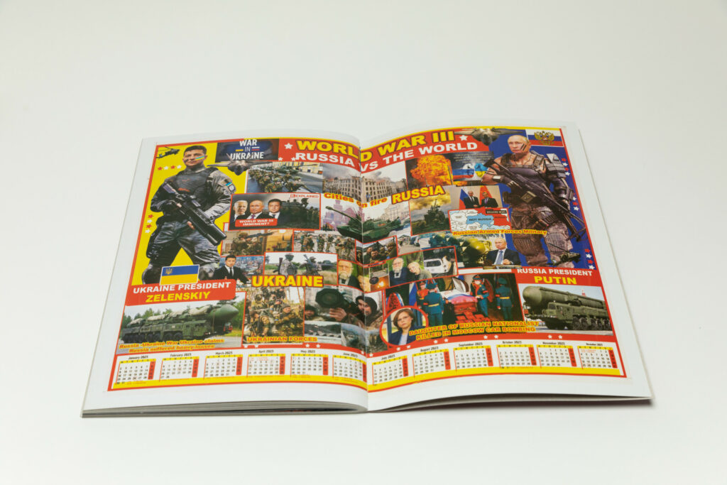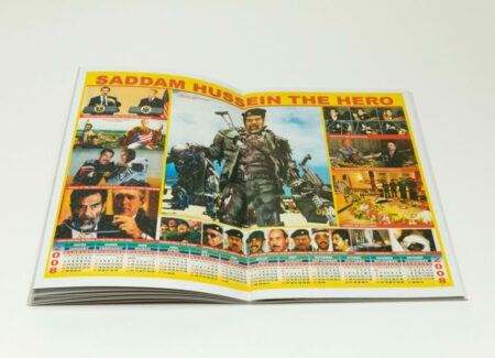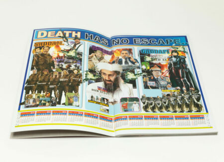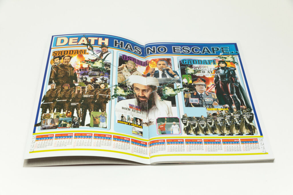 The very first poster in the book, printed full spread, has a heading at the very top reading “Death has no escape” in all caps, and is divided into three sections dedicated to Hussein, bin Laden, and Gaddafi, with each section constructed as a collage of various elements. The 2013 monthly calendar appears at the very bottom. As an object, it is visually rich and striking, but also humorous.