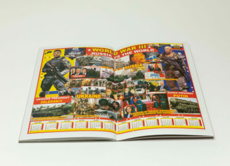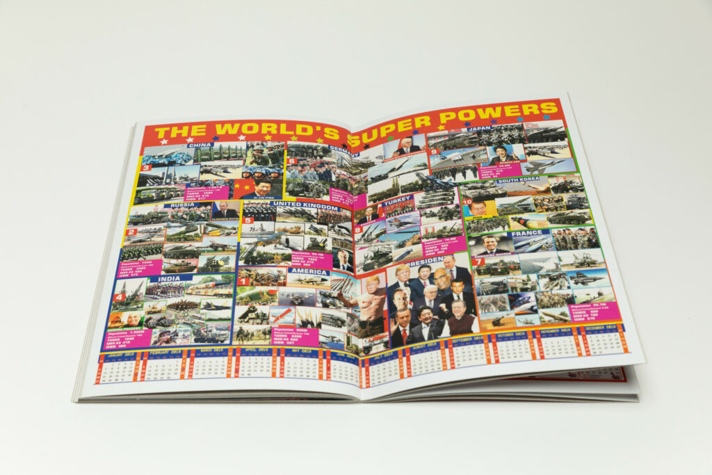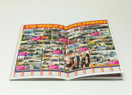 Close to the end of the book, another poster takes up yet another full spread. “THE WORLD’S SUPER POWERS” reads the header in all caps in yellow font placed against a red background dotted with stars. The design is broken down into ten sections, one per country, and each section includes a collection of images, featuring leaders and military personnel, and providing brief statistics on its population and military arsenal.
