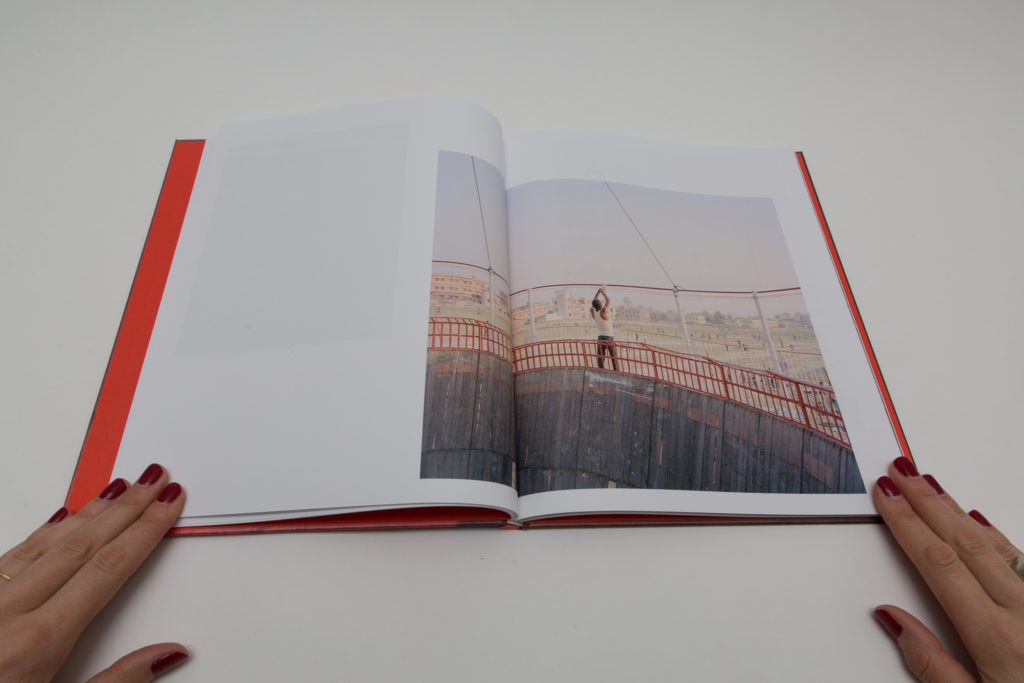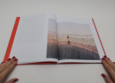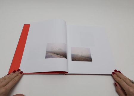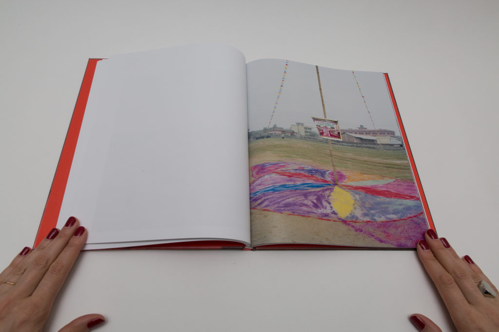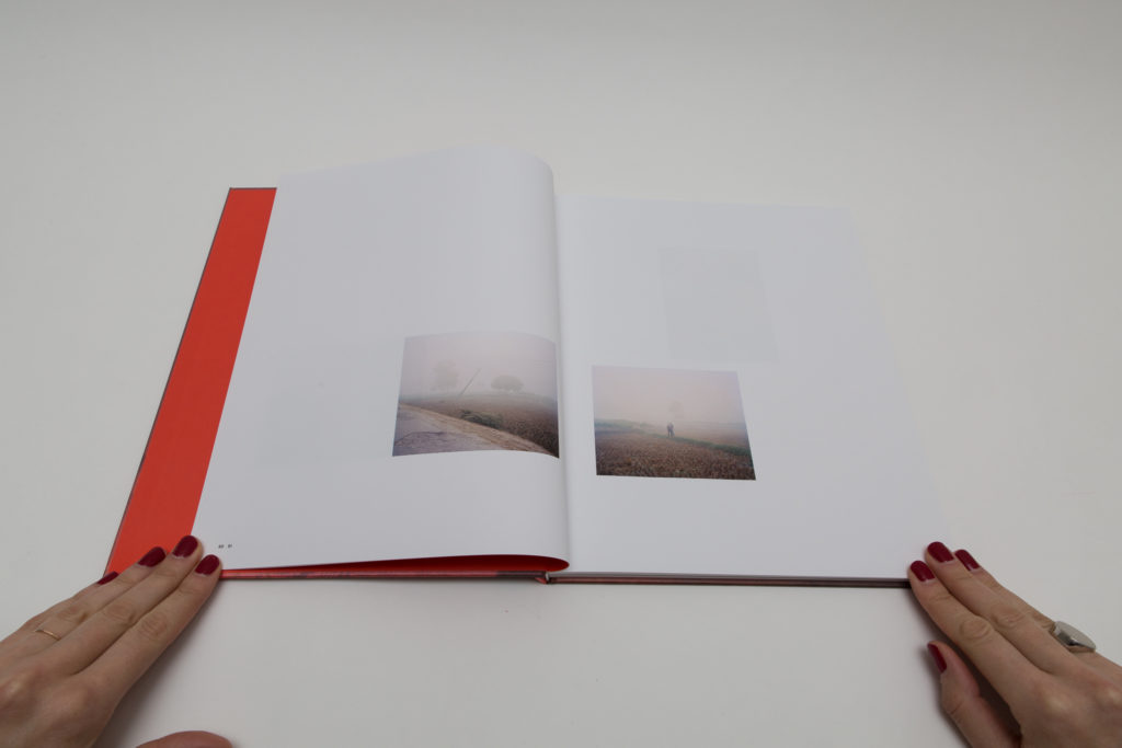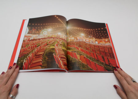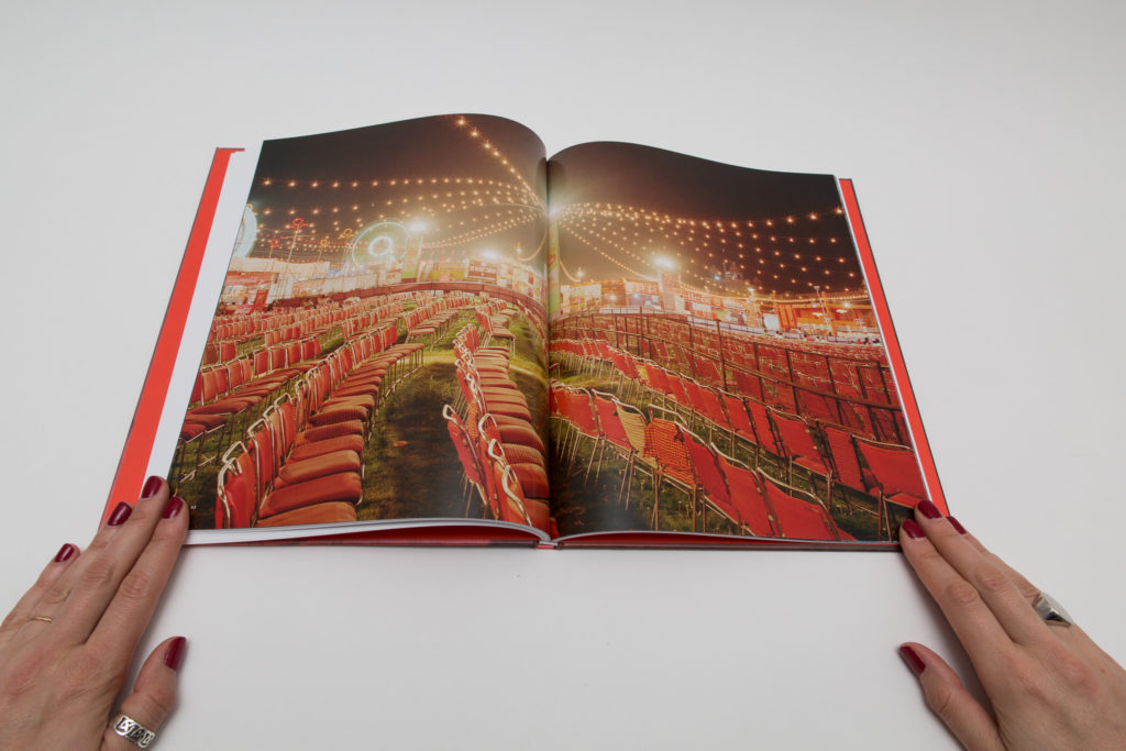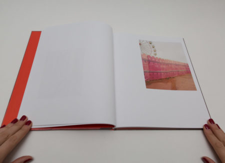 As the story progresses, the images get bigger and reach their highest point with the wedding. Full spread photographs are colorful and printed on glossy paper. Wedding festivities are documented through the images of a royal castle, crowds of happy people, food and, of course, fireworks. One of them shows rows of red chairs in the open air with bright decorative lights over, and another depicts a massive gathering of people in colorful outfits with a few of them dancing. There is a sense of celebration and happiness. A portrait of the couple (first seen on the cover) appears in the middle of the book, on paper ⅔ shorter than other pages, placing them literally in the middle of the festivities.