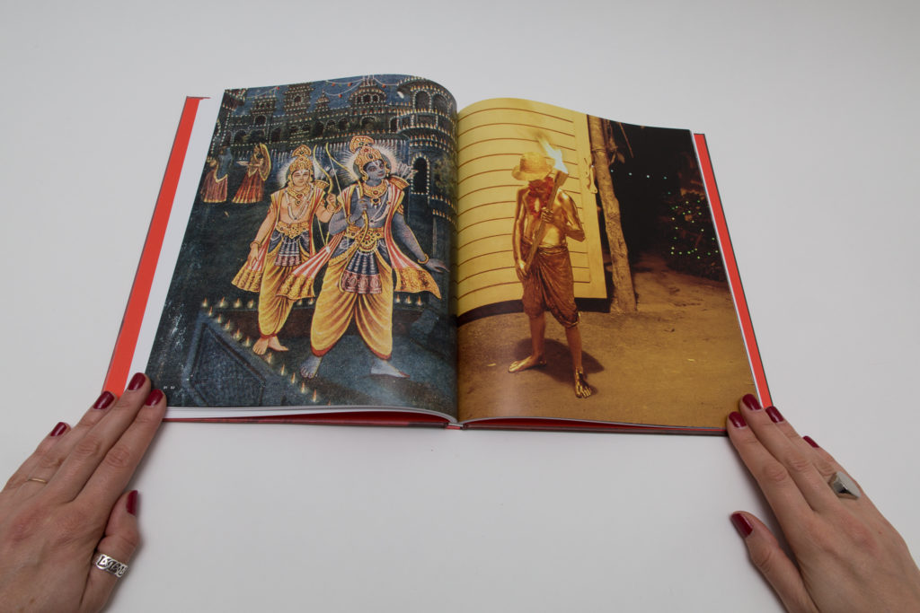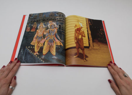 As a photobook, The Promise has an elegant design, an elaborate concept and excellent print quality. Its cover immediately grabs attention: an old-fashioned wedding portrait of Rama and Sita appears in full bleed with a red shimmer. The book omits page numbers but thoughtfully numbers the images picking up from the first book, symbolically marking the continuation of the narrative. The layout plays an essential role in building the dynamic. The main text (rewritten by Arshia Sattar) appears throughout the book in light pink, placing the images specifically inside the existing plot of the Ramayana.