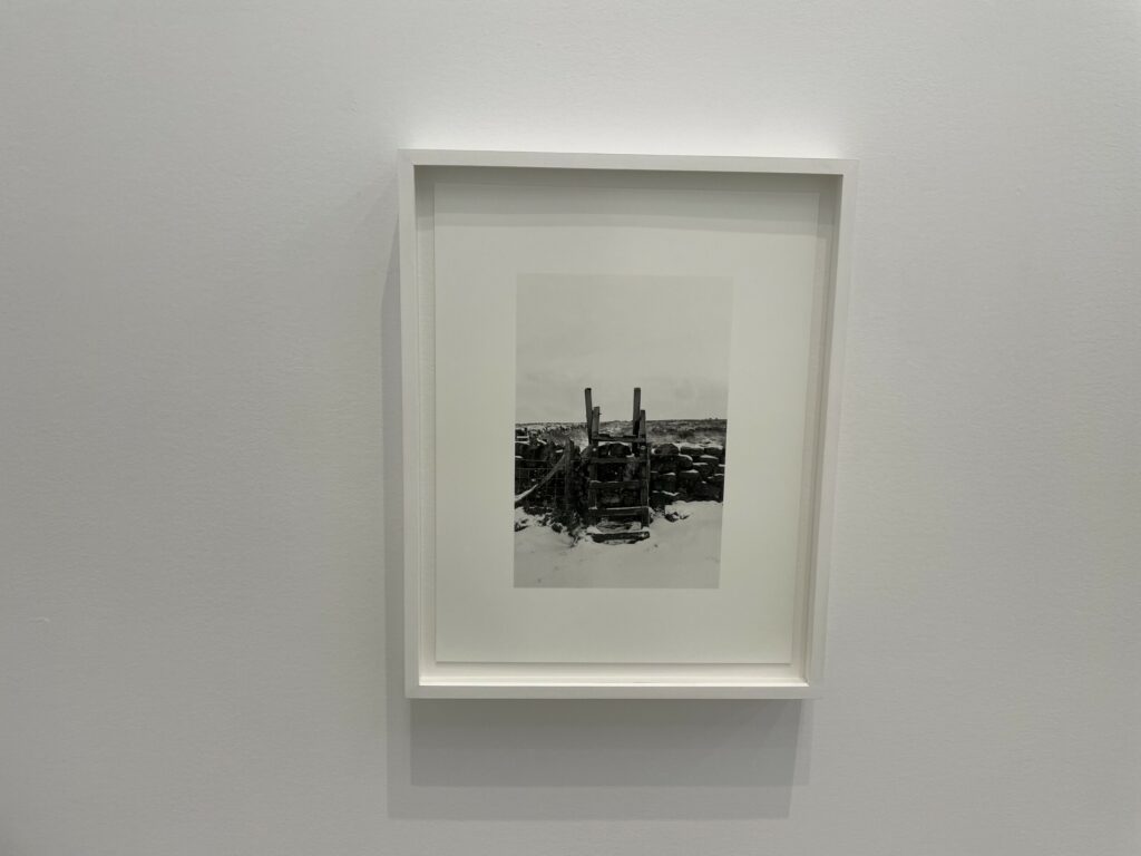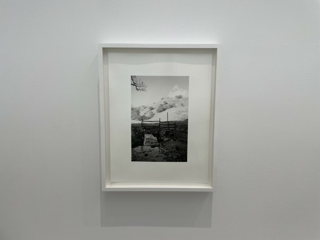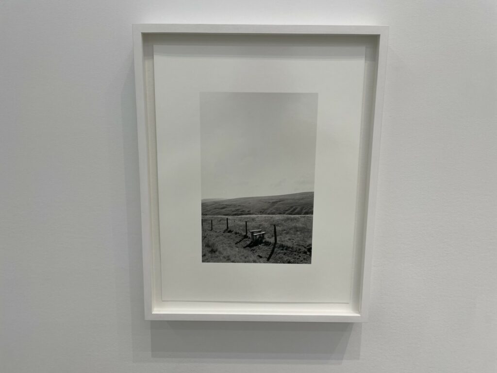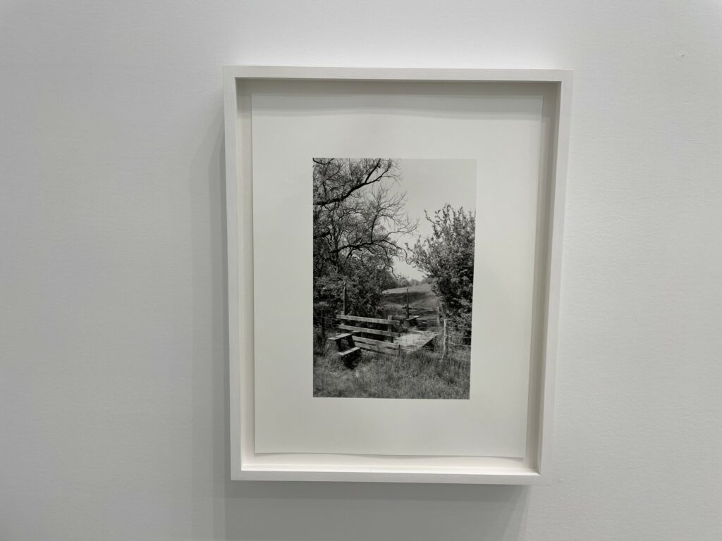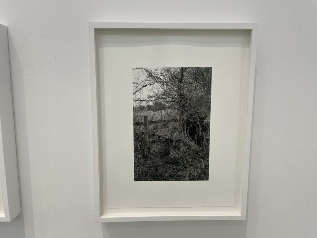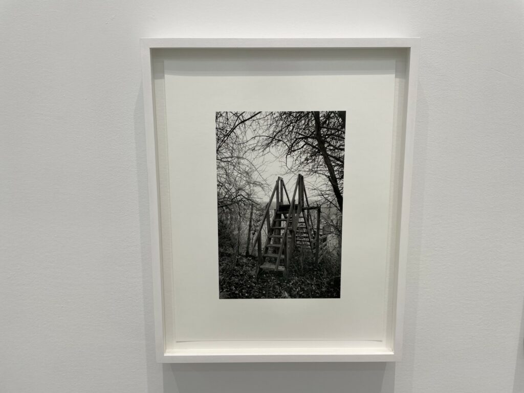 A quick visual sweep of this gallery show will likely leave some visitors underwhelmed, but it is the modesty and calmness of these precisely crafted black-and-white photographs that gives them some durability. It’s clear that Contis has a fondness for these lands and for the humble ingenuity that the stiles represent, and that the process of walking and seeing has been an immersively meditative balm for her. Her pictures allude to implied tensions of ownership, crossings, and borders that shape the land, but largely leave these threads unexplored, at least overtly. What we feel most in these photographs is a kind of wry appreciation for patterns and flows of open country walking, where even an outsider can feel welcomed by the unexpected appearance a thoughtful aid left by the landowner. Such constructions and accommodations seem to signal that we are all welcome as part of the community of walkers, and that if we take the time to help each other even just a little bit, the forward motion can go on unimpeded.