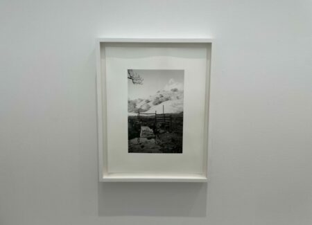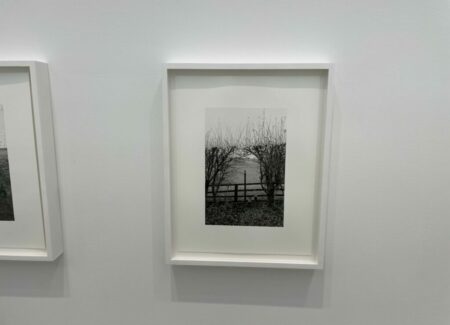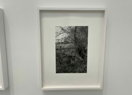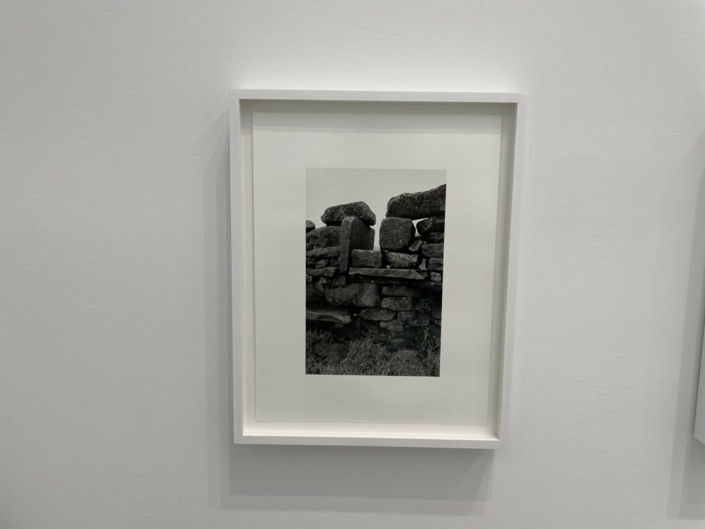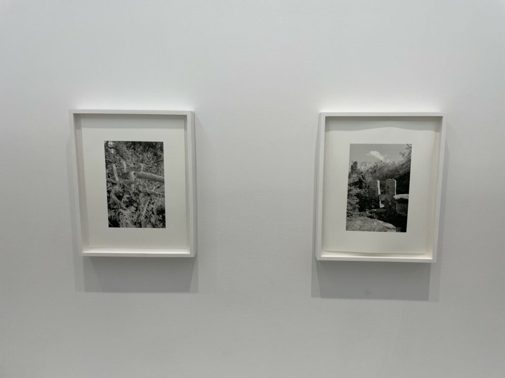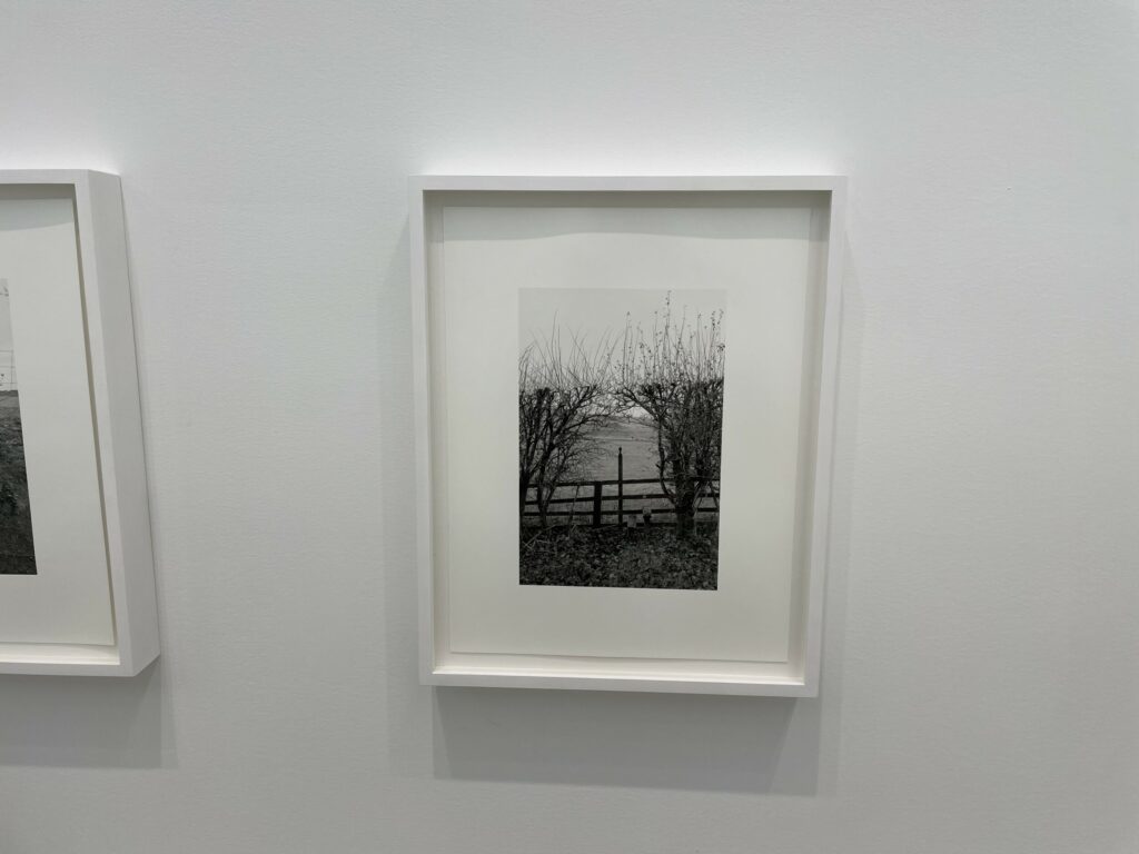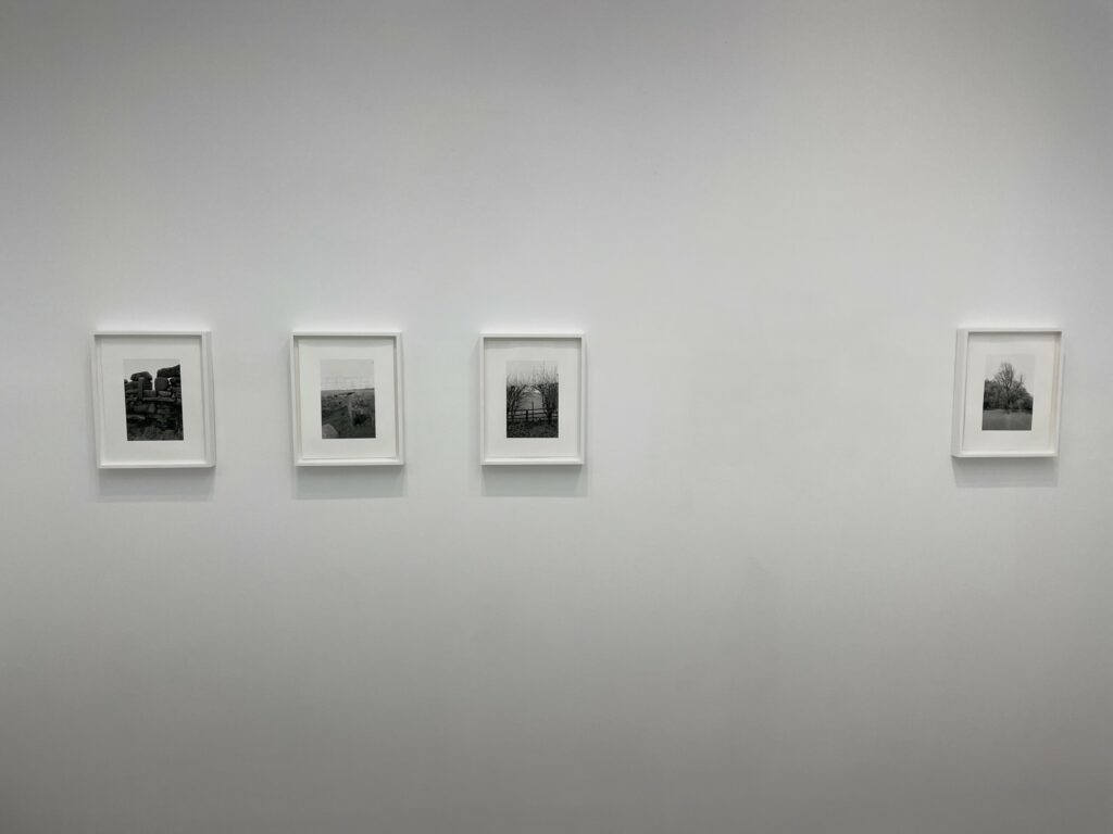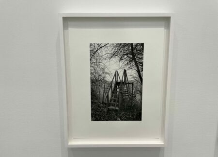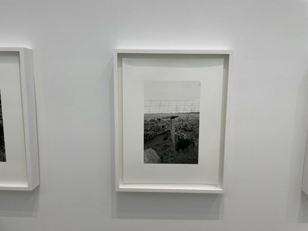 A quick visual sweep of this gallery show will likely leave some visitors underwhelmed, but it is the modesty and calmness of these precisely crafted black-and-white photographs that gives them some durability. It’s clear that Contis has a fondness for these lands and for the humble ingenuity that the stiles represent, and that the process of walking and seeing has been an immersively meditative balm for her. Her pictures allude to implied tensions of ownership, crossings, and borders that shape the land, but largely leave these threads unexplored, at least overtly. What we feel most in these photographs is a kind of wry appreciation for patterns and flows of open country walking, where even an outsider can feel welcomed by the unexpected appearance a thoughtful aid left by the landowner. Such constructions and accommodations seem to signal that we are all welcome as part of the community of walkers, and that if we take the time to help each other even just a little bit, the forward motion can go on unimpeded.