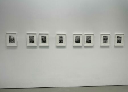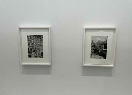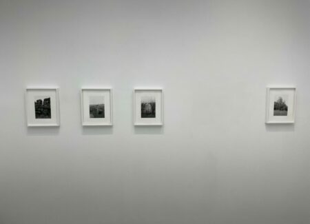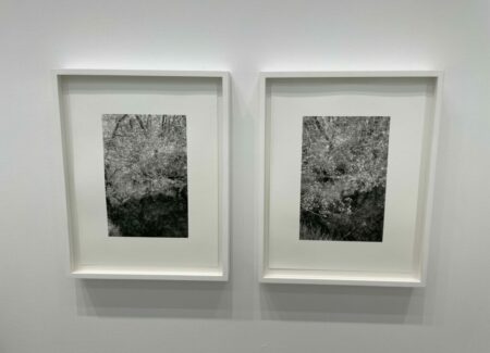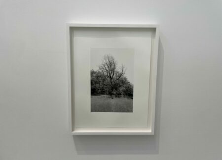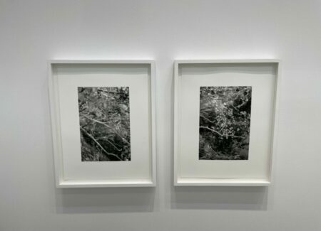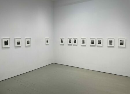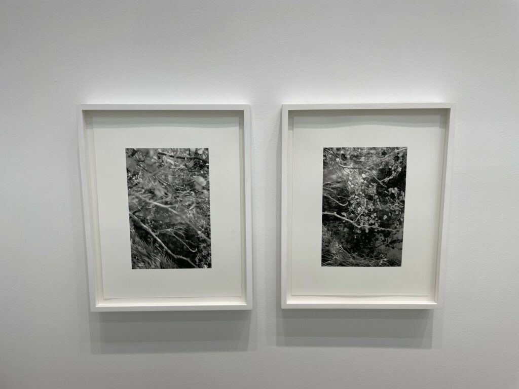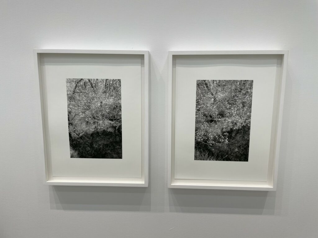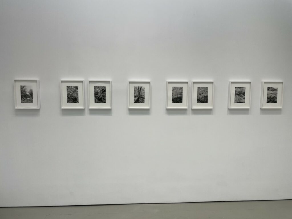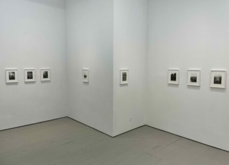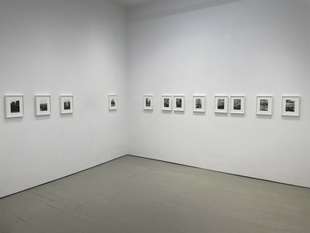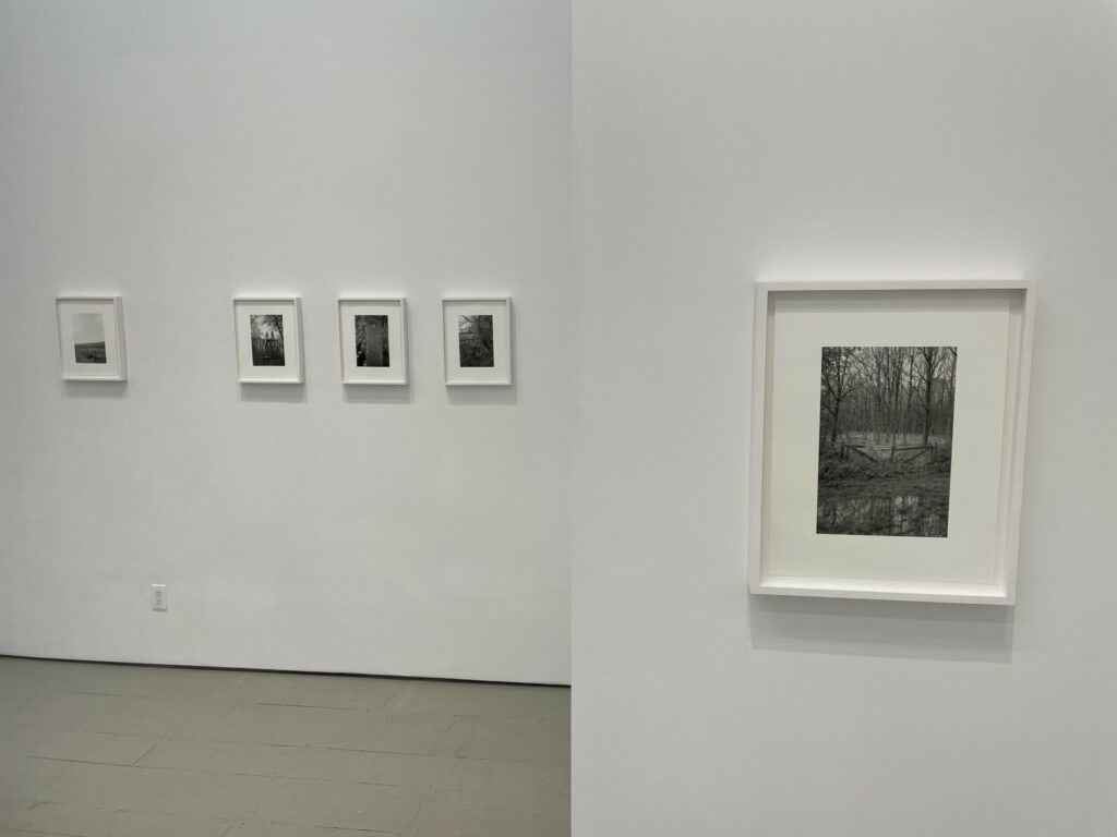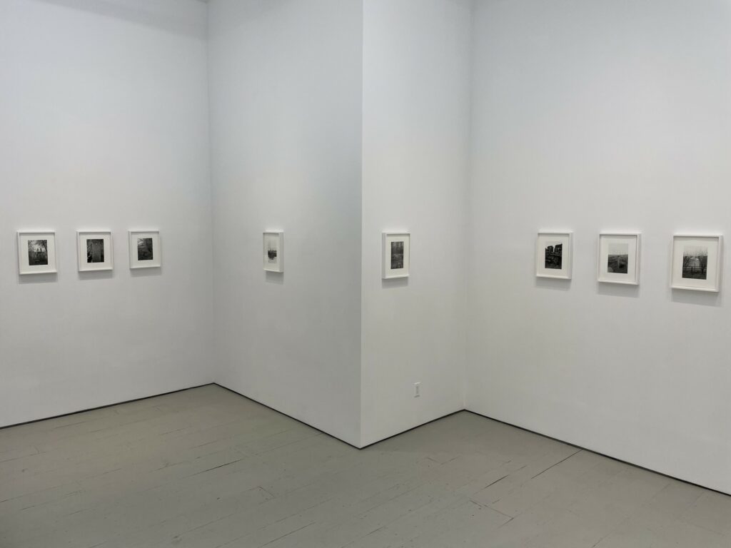 JTF (just the facts): A total of 21 black-and-white photographs, framed in white and matted, and hung against white walls in the single room front gallery space. All of the works are gelatin silver prints, made in 2020-2022. Each is sized roughly 9×6 inches. 12 of the works are single images, while the other 9 works are grouped together into one set. All of the prints are available in editions of 5+2AP. (Installation shots below.)
