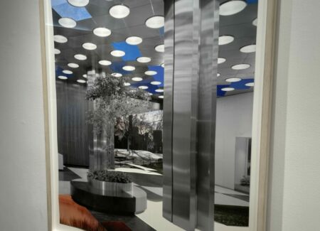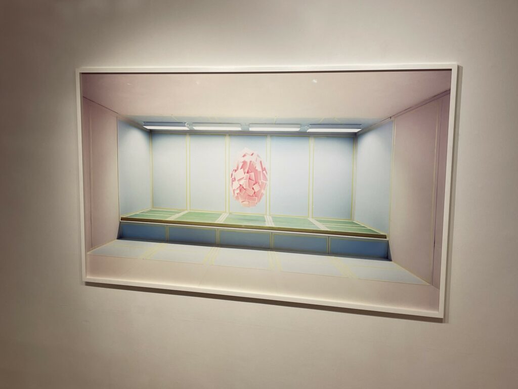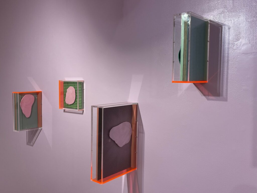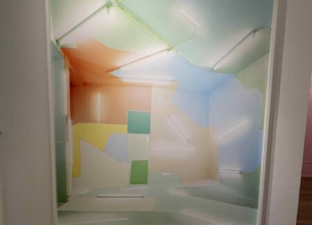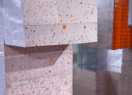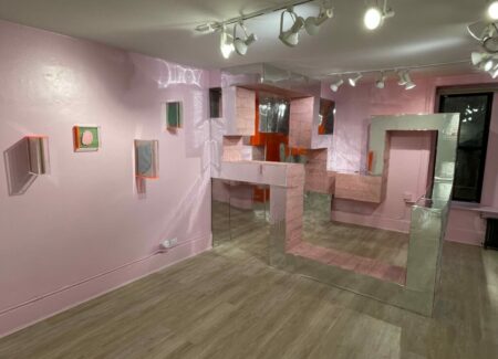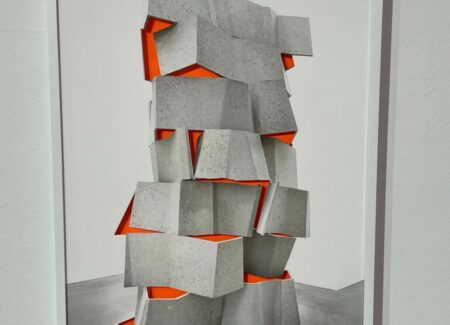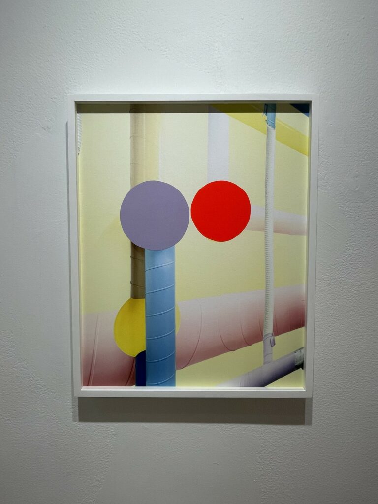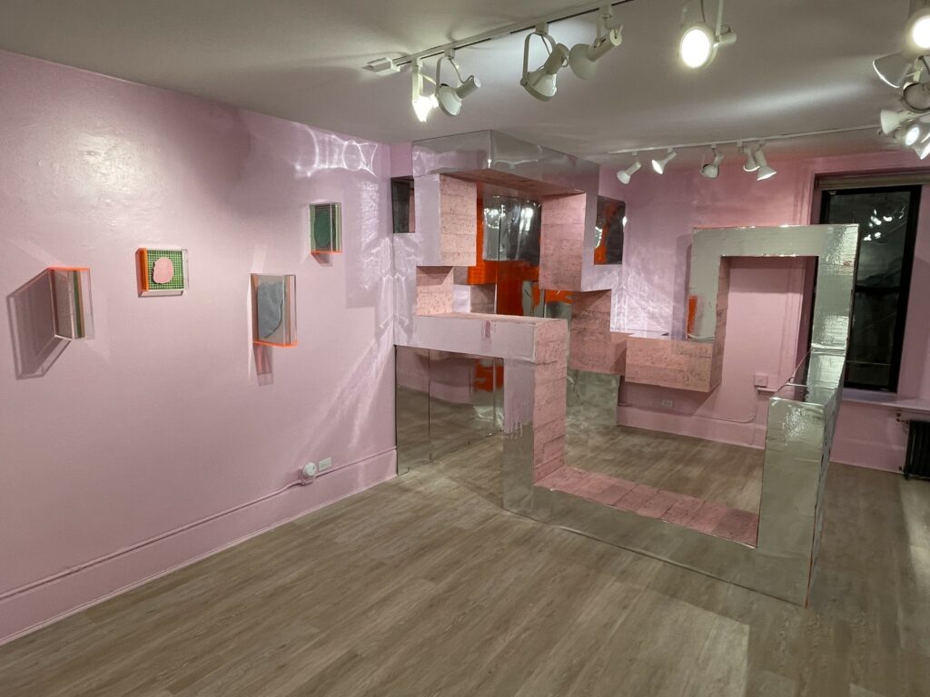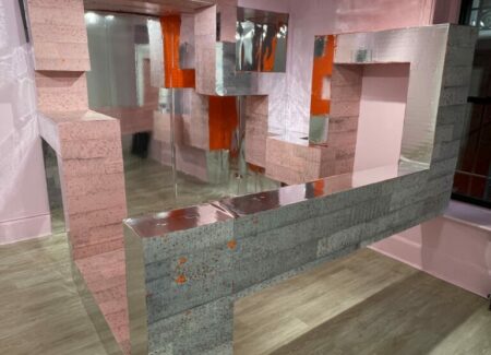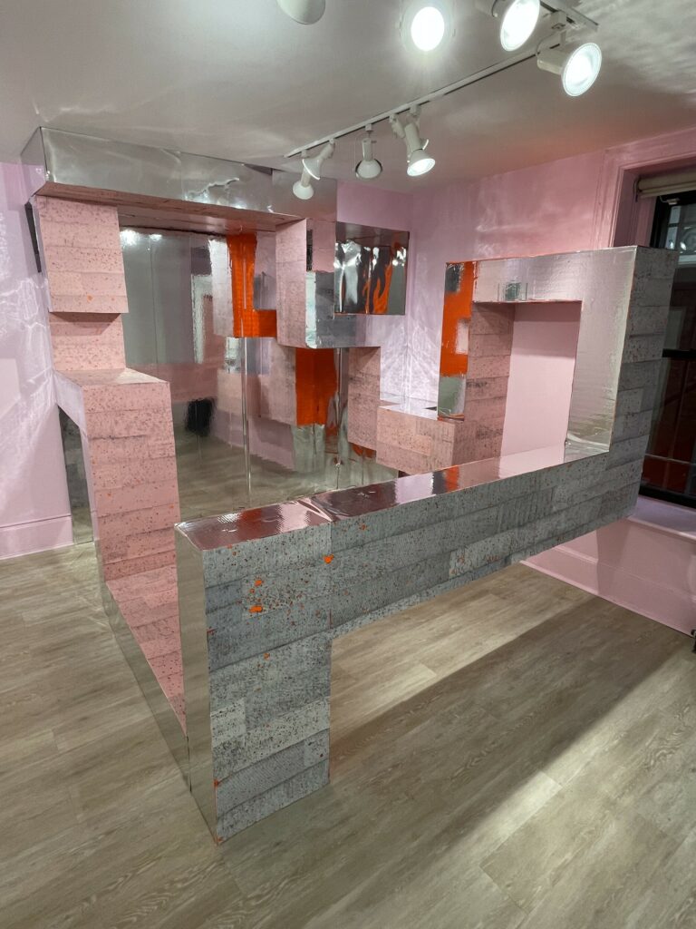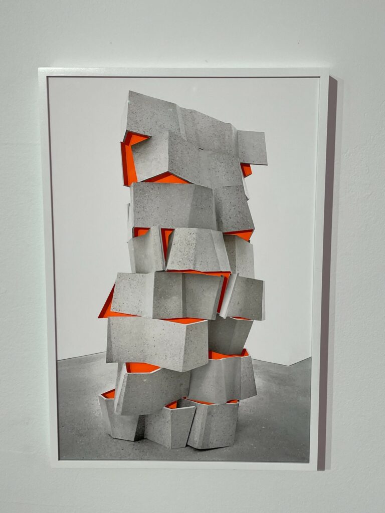 Sleeuwits’s installation (in the lower level gallery) not only bathes the low ceilinged space in light pink, it builds out from the walls in an up-and-down geometric trail, like blocks added iteratively that bend around like ductwork. The surfaces are either mirrored foil, neon orange plastic, or covered with photographic reproductions of cast concrete, making the roughness and irregularities of the material actually smooth, but also perforated by actual burned holes. Her maze-like installation reconfigures the space with reflections and subtle illusions, connecting back to her photographs that achieve similar effects.
