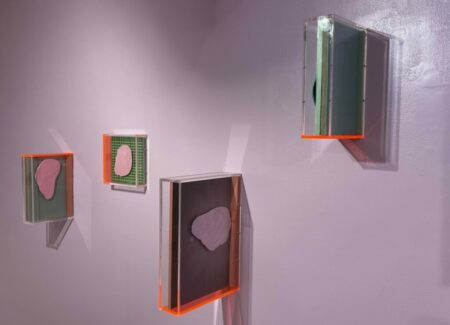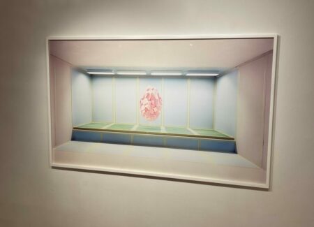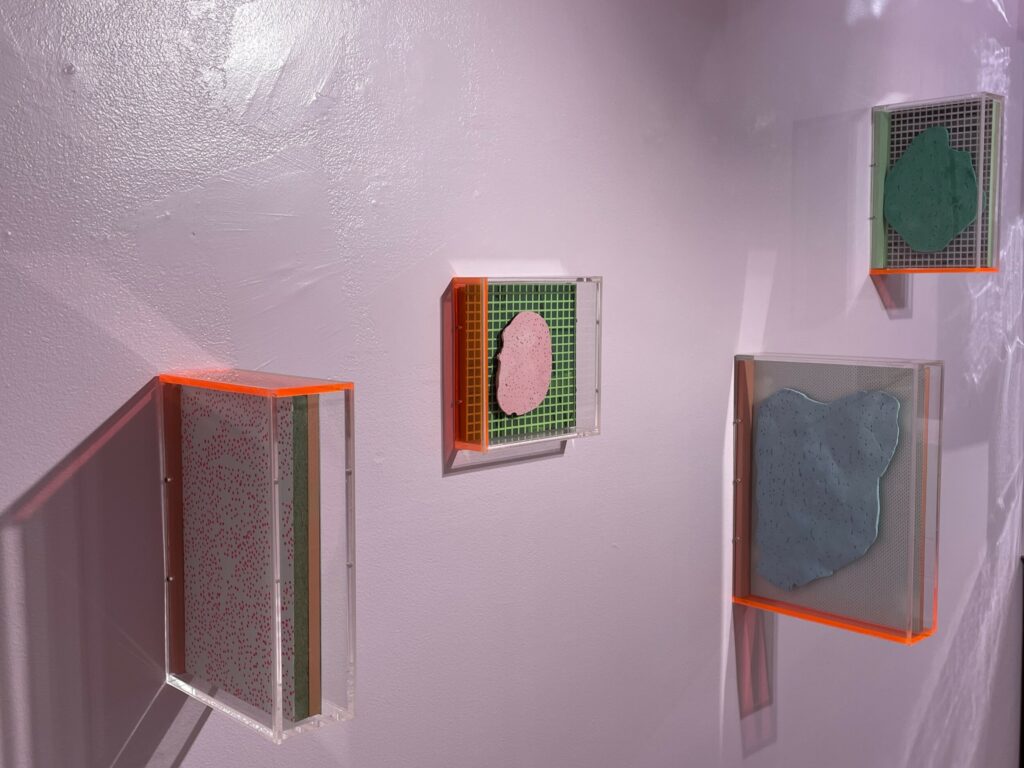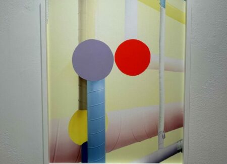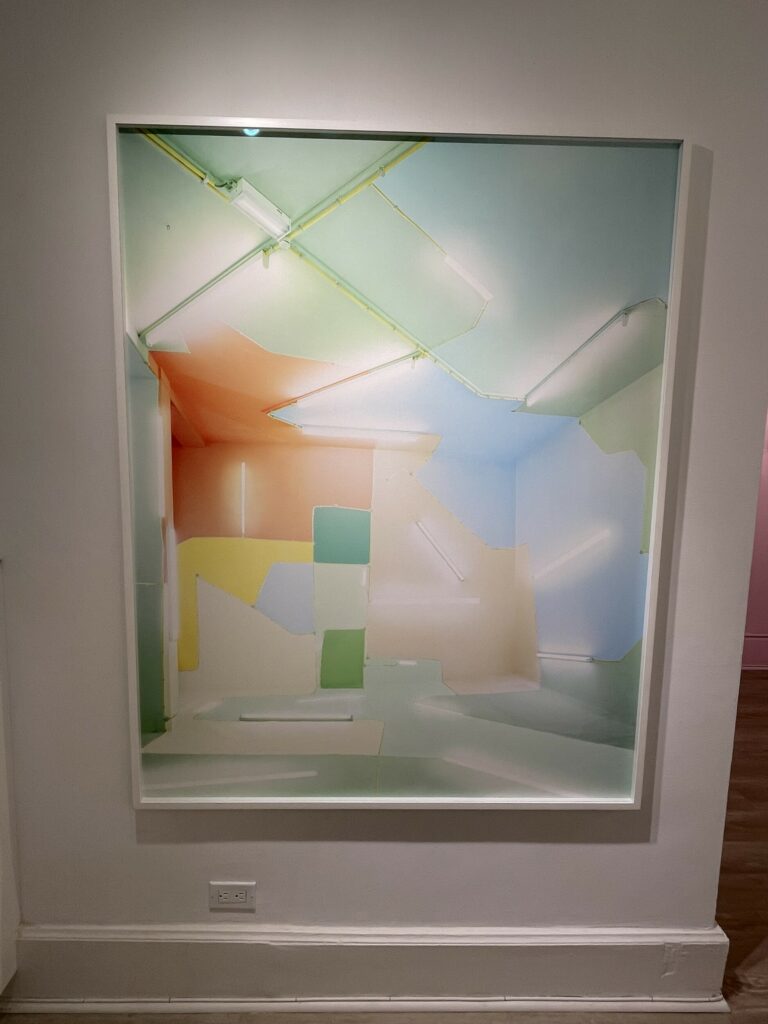 Sleeuwits takes an alternate approach, starting with anonymous spaces and then adding interventions and installations which she then photographs, and in some cases further interrupts once the images are physical prints. Using pastel paints, paper, extension cords, fluorescent lights, and foam blocks, she reconfigures the interior spaces, creating patterns and geometries that are then captured by the camera. Several reimagined interiors are on view in this show, with an actual lightbox placed behind one print to make the light bars even more bright. Other recent works use various textural ceiling tiles as a substrate for sculptural interventions made of globular plaster, the two-sided works then hung perpendicular to the wall in plexiglass boxes.