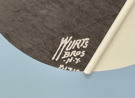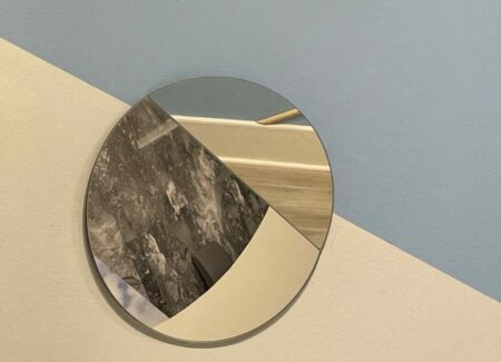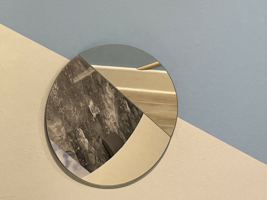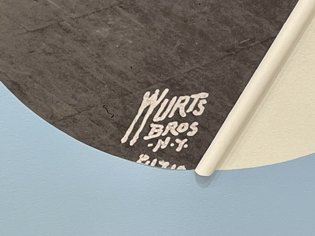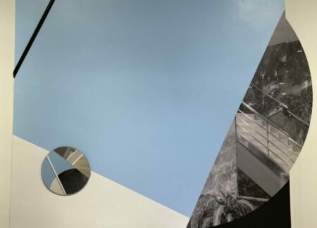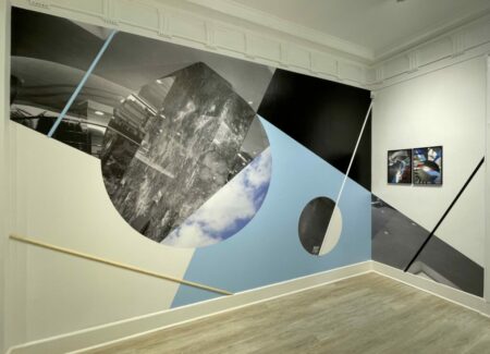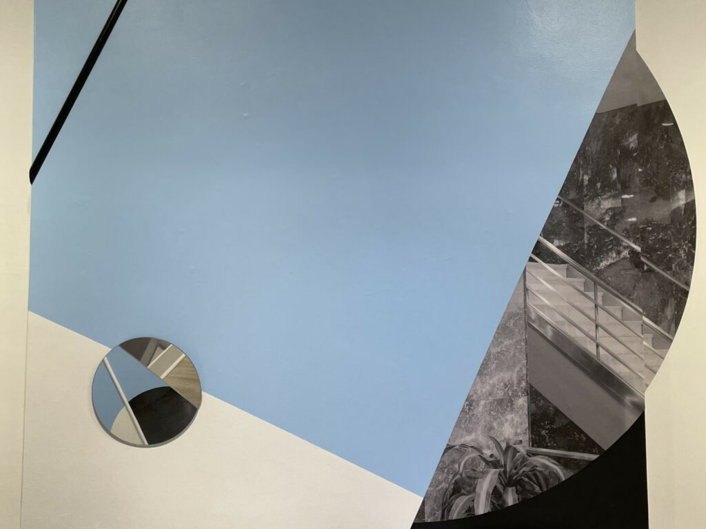 Boserup’s installation (in the upstairs space) starts with a 1947 hotel interior photograph by the Wurts Bros., the image discovered in the collection of the Museum of the City of New York. She covers three walls of the gallery and incorporates the existing marble fireplace in her design, mixing imagery, color fields of light blue and black, straight wooden sticks (painted various colors), and a circular mirror, creating an angled tumbling effect as the circles rotate around the small room and the original image is fragmented and repurposed. The sticks can be seen as linear interventions or drawn lines, reorienting the geometries of the space and playing off the strict horizontals of the existing floor and ceiling moldings, and the mirror alternately reflects different positional layers, depending on the vantage point of the viewer. The result is an elegantly enveloping experience, like being placed inside one of Boserup’s collages.