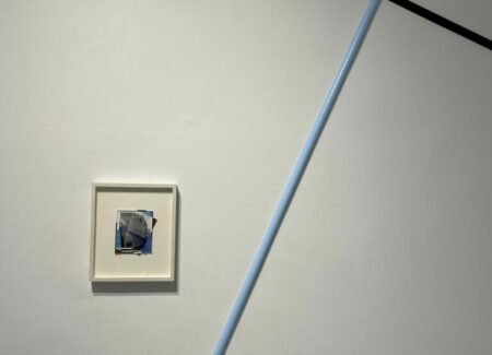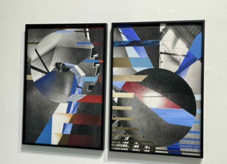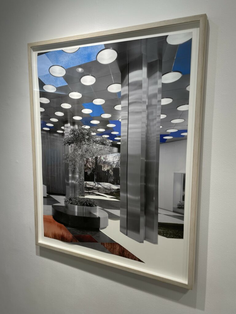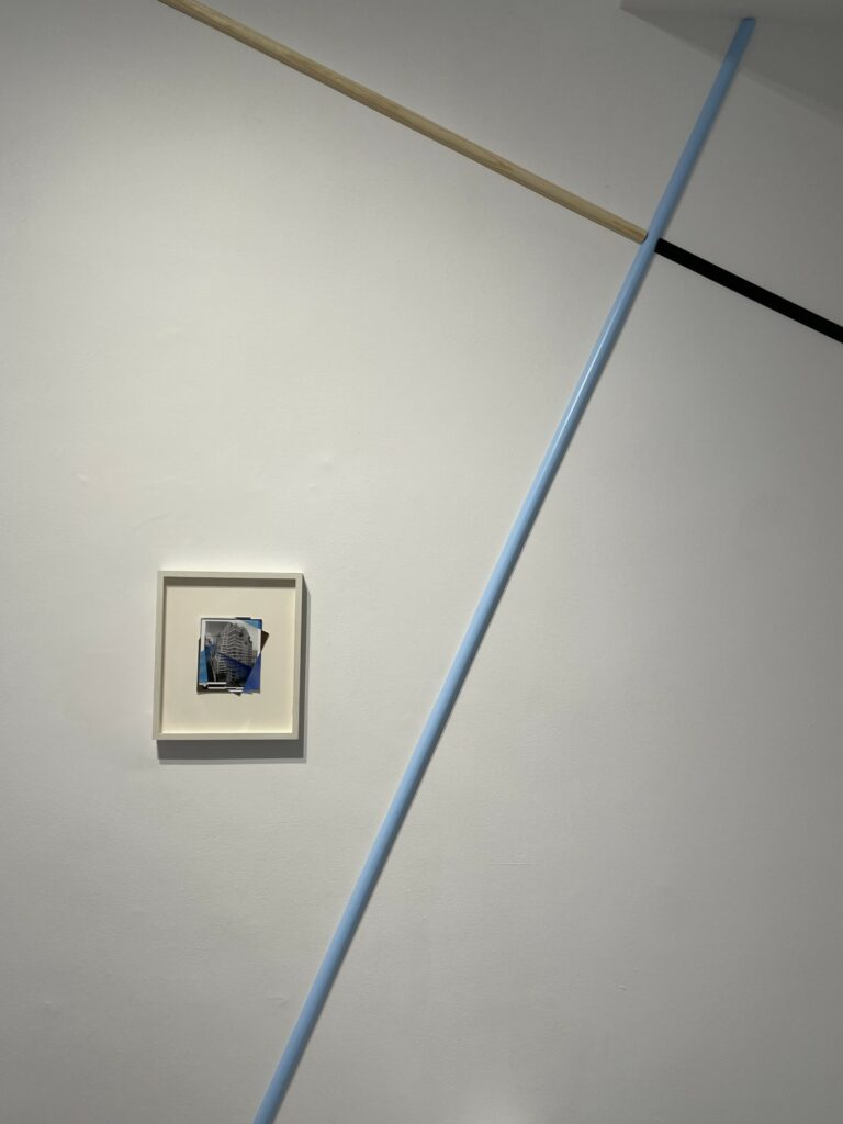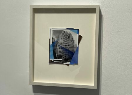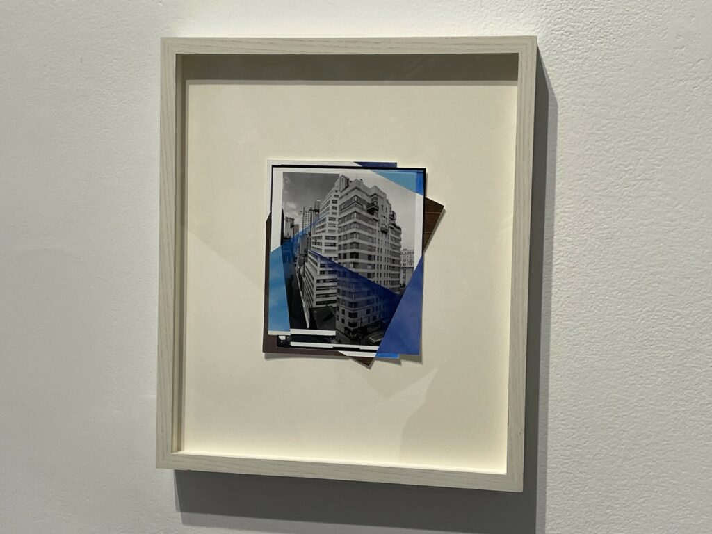 Boserup’s engagement with photography comes through collage, where she reorients archival images of buildings, interiors, and other architectural spaces with cuts, folds, reassembly, drawing, and other techniques. One framed work on view here finds her upending a sleek lobby image with squares of blue sky and pink sunset, and illusionistically bringing the outdoors inside. A group of others uses lyrical folds, twists, overlaps, and interruptions to reimagine images of buildings. And still other works employ geometric circles and stripes of varying sizes and widths to turn and reassemble interior space, with color (especially blue) used to reimagine black-and-white scenes.