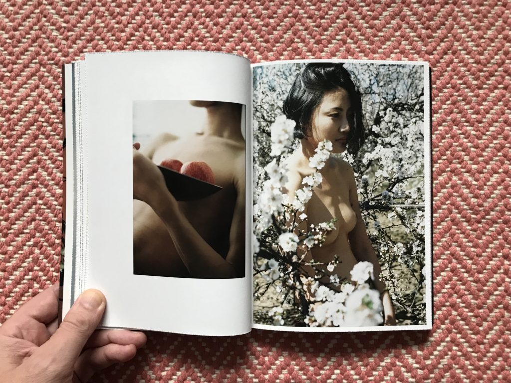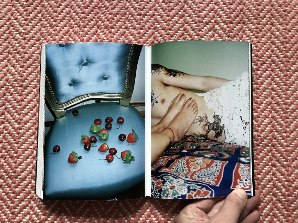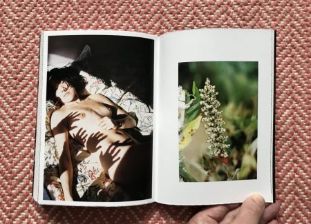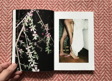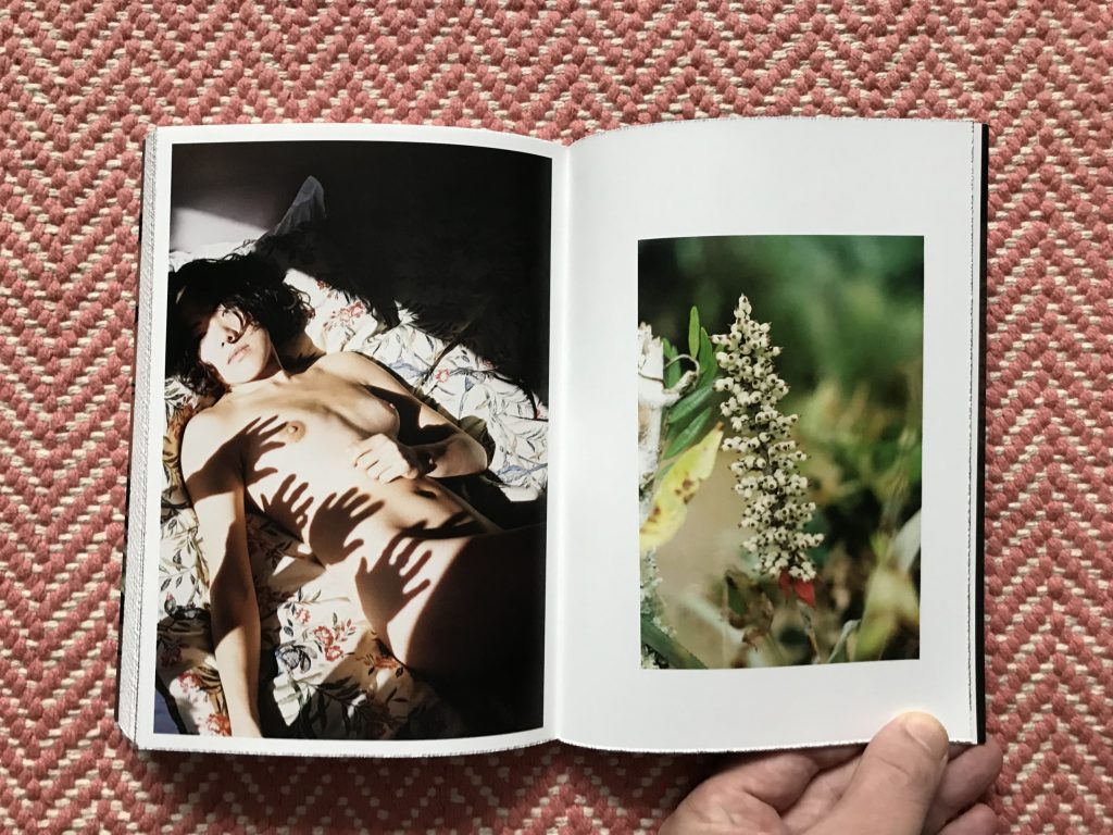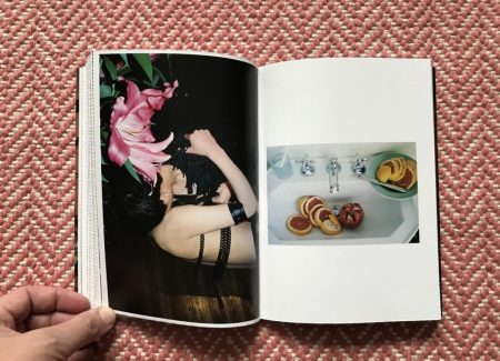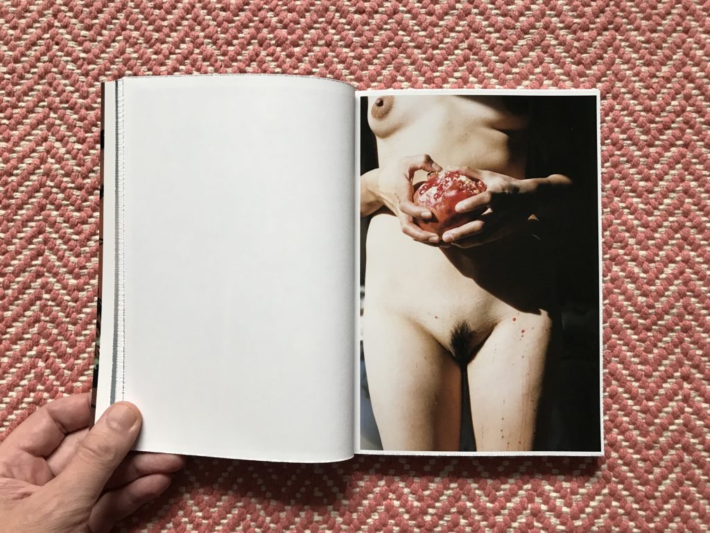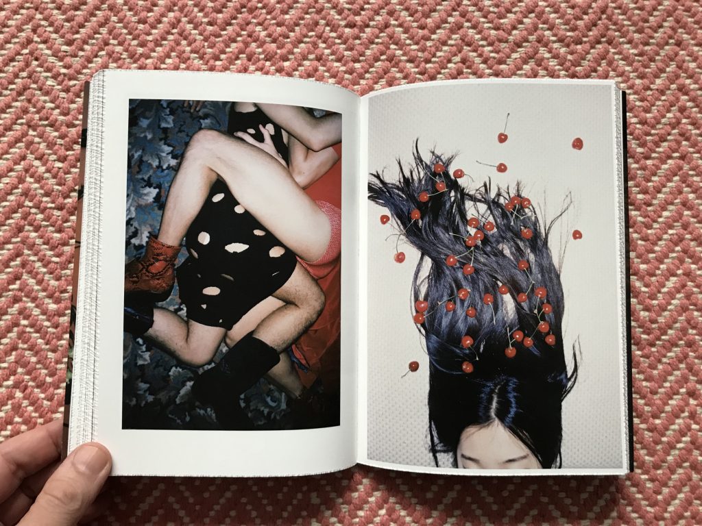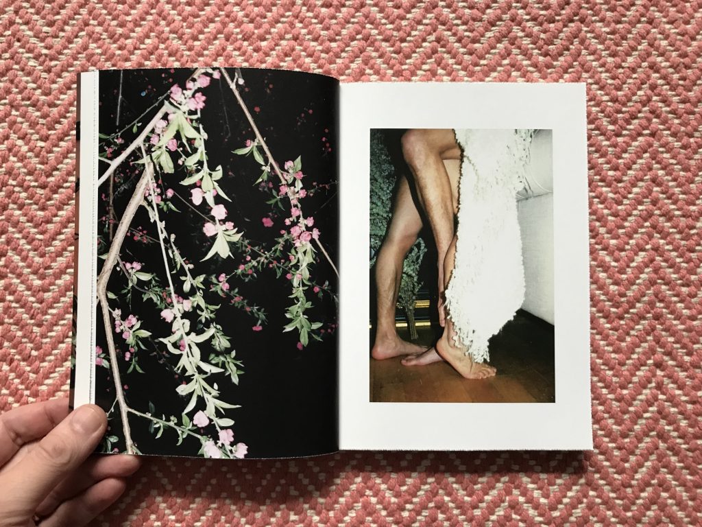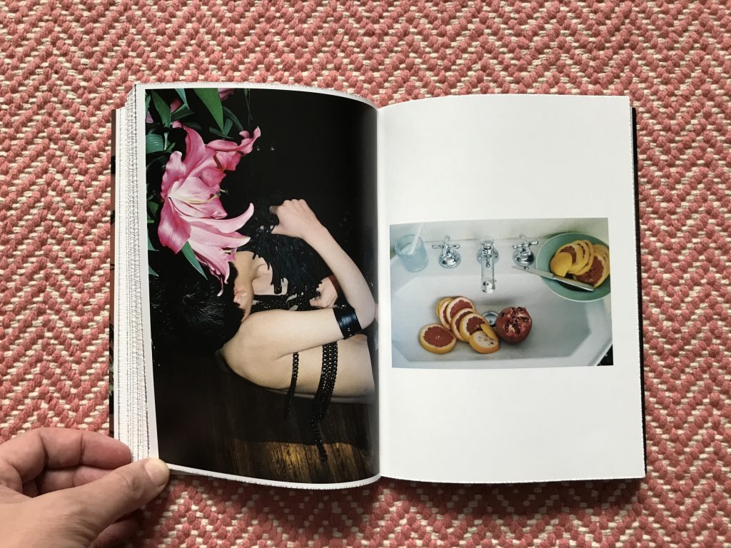 There are plenty of singular images worth finding in the pages of Flowers and Fruit. Misty smoke nestles in a bouquet of roses, cherries tumble from a wash of dark hair, legs tangle in a confusing mess around a black dress with holes, a man bends his foot toward a plant covered in light pink flowers, and a woman walks among a blizzard of white blossoms, each one a lovely self-contained meditation. The design of the photobook is simple, casual, and unobtrusive, its modest size making it easy to hold and contemplate. The images alternate between full bleed and bordered reproductions of various sizes, allowing interest to build through the page turns.