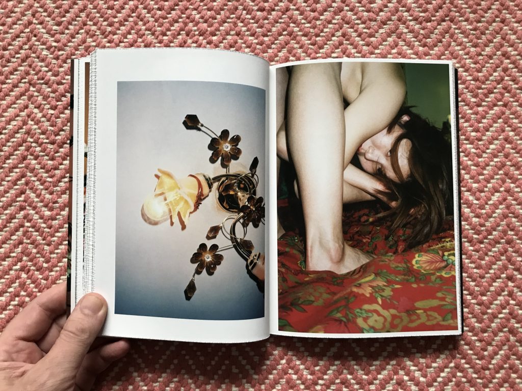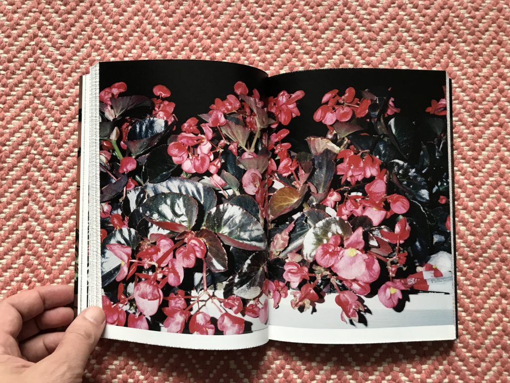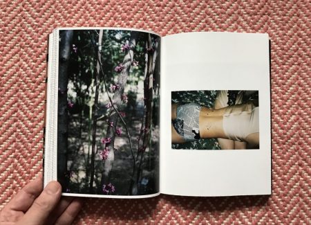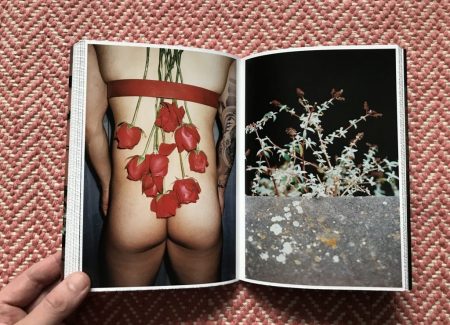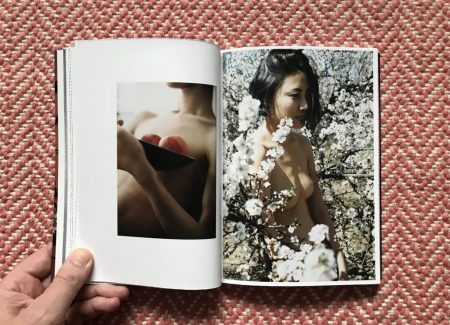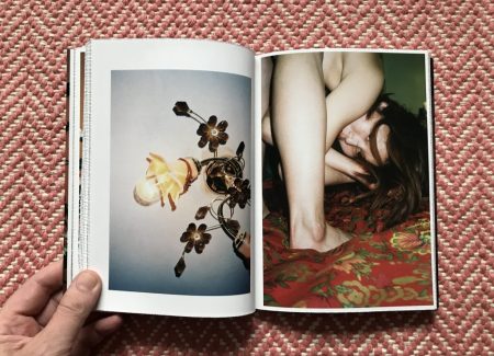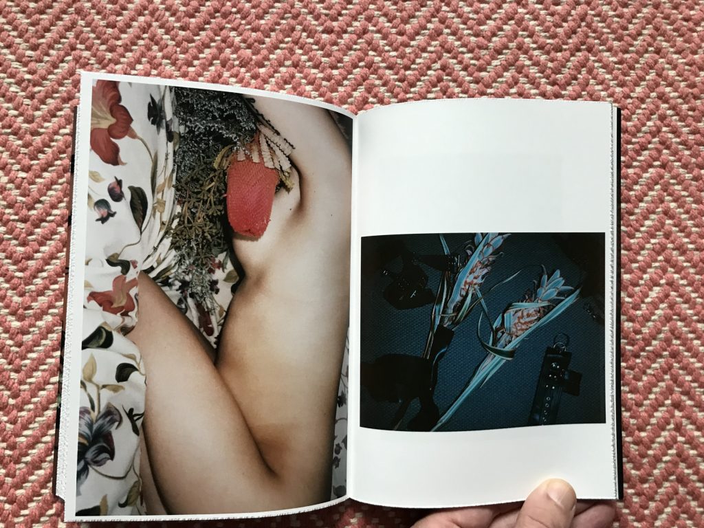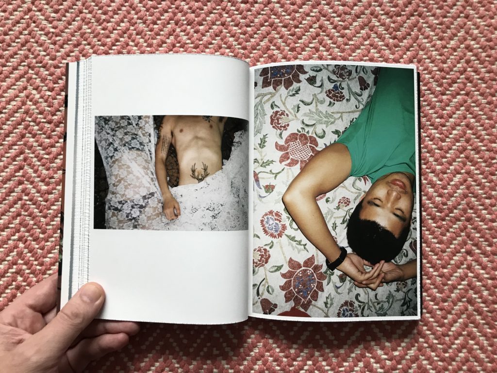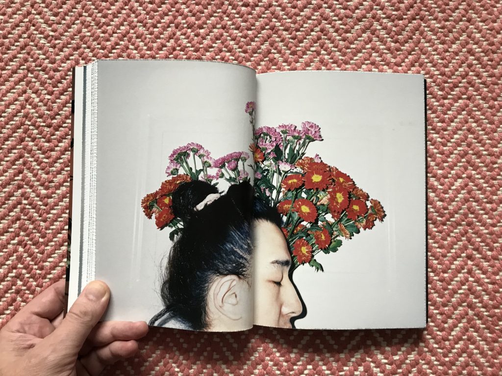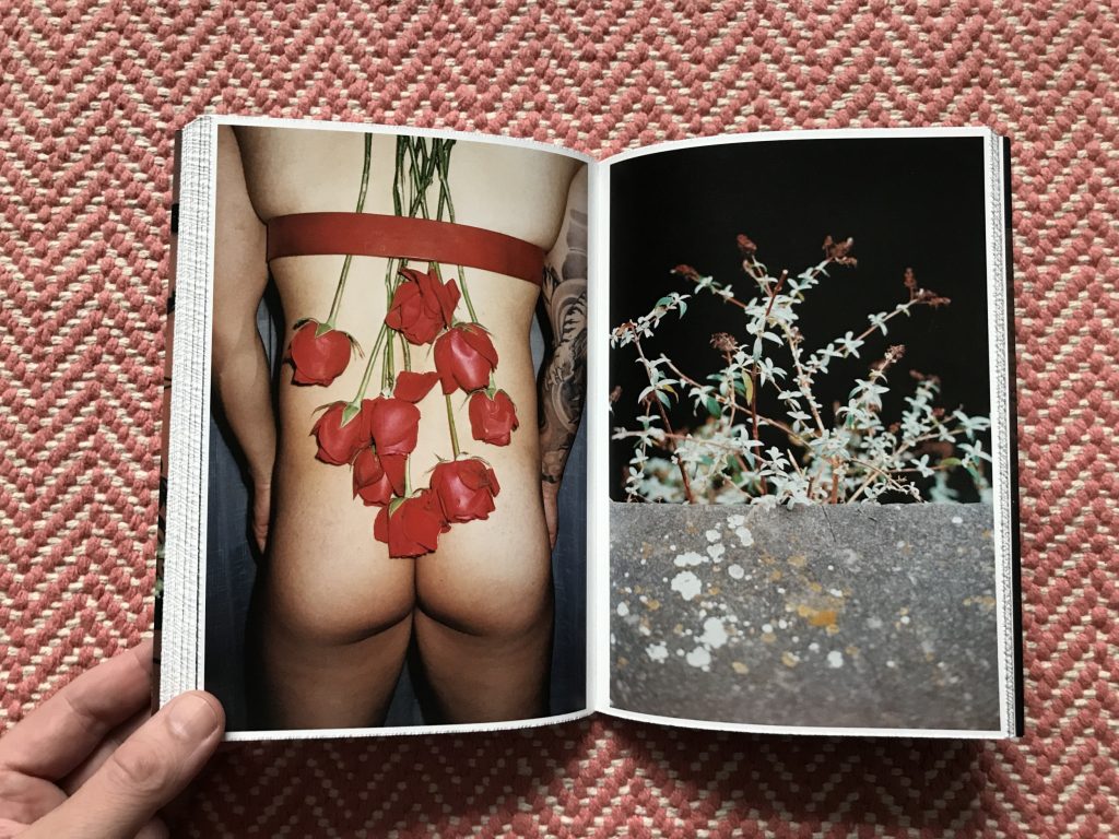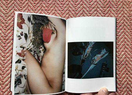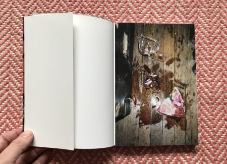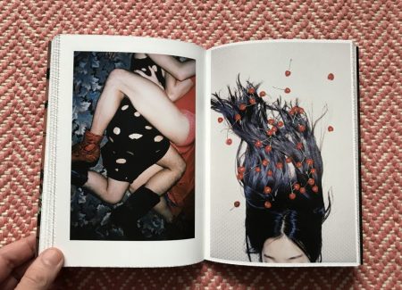 There are plenty of singular images worth finding in the pages of Flowers and Fruit. Misty smoke nestles in a bouquet of roses, cherries tumble from a wash of dark hair, legs tangle in a confusing mess around a black dress with holes, a man bends his foot toward a plant covered in light pink flowers, and a woman walks among a blizzard of white blossoms, each one a lovely self-contained meditation. The design of the photobook is simple, casual, and unobtrusive, its modest size making it easy to hold and contemplate. The images alternate between full bleed and bordered reproductions of various sizes, allowing interest to build through the page turns.