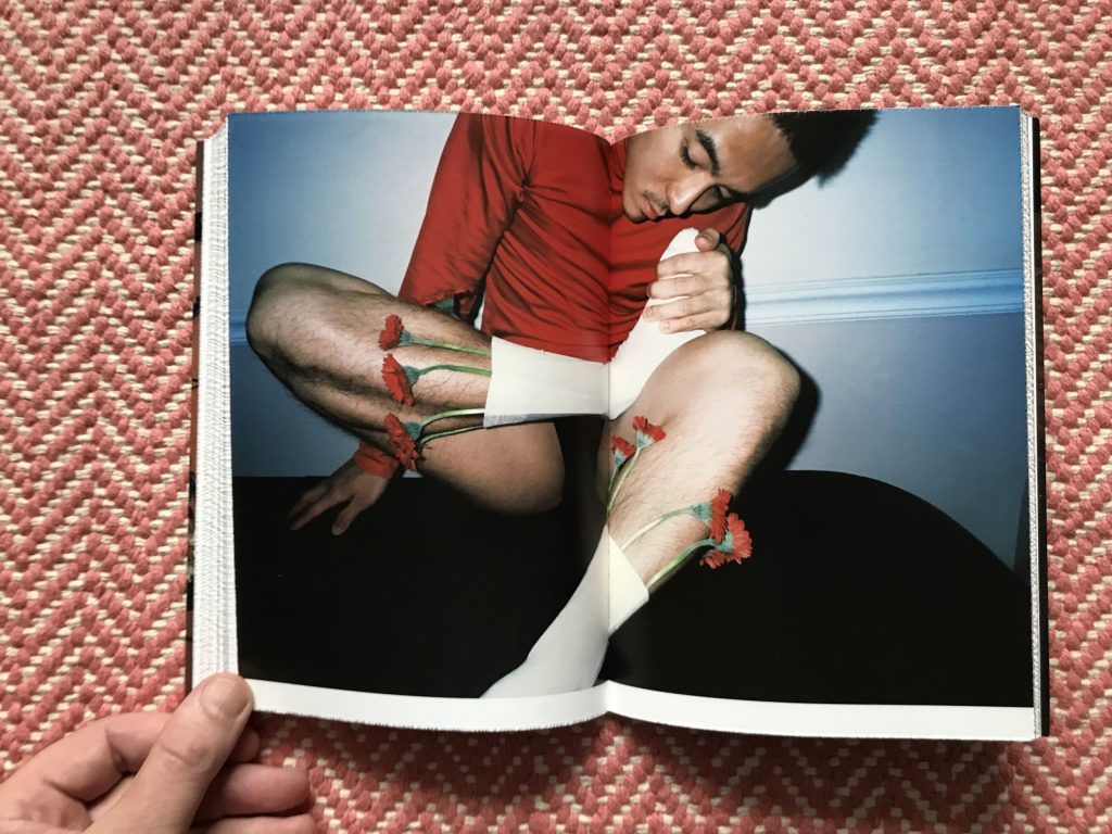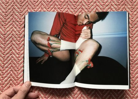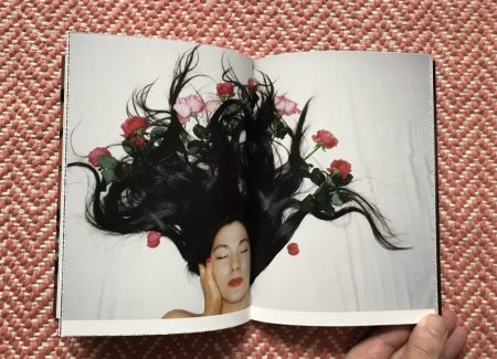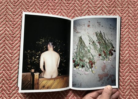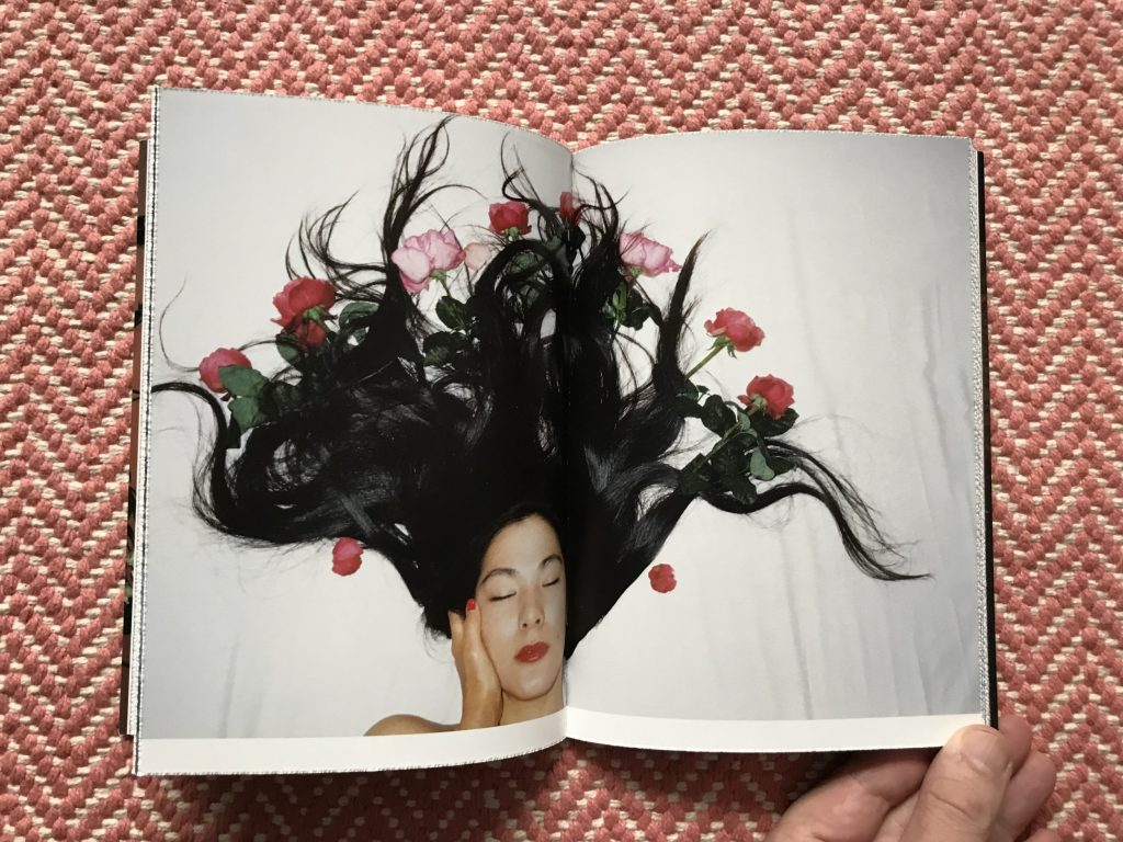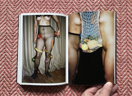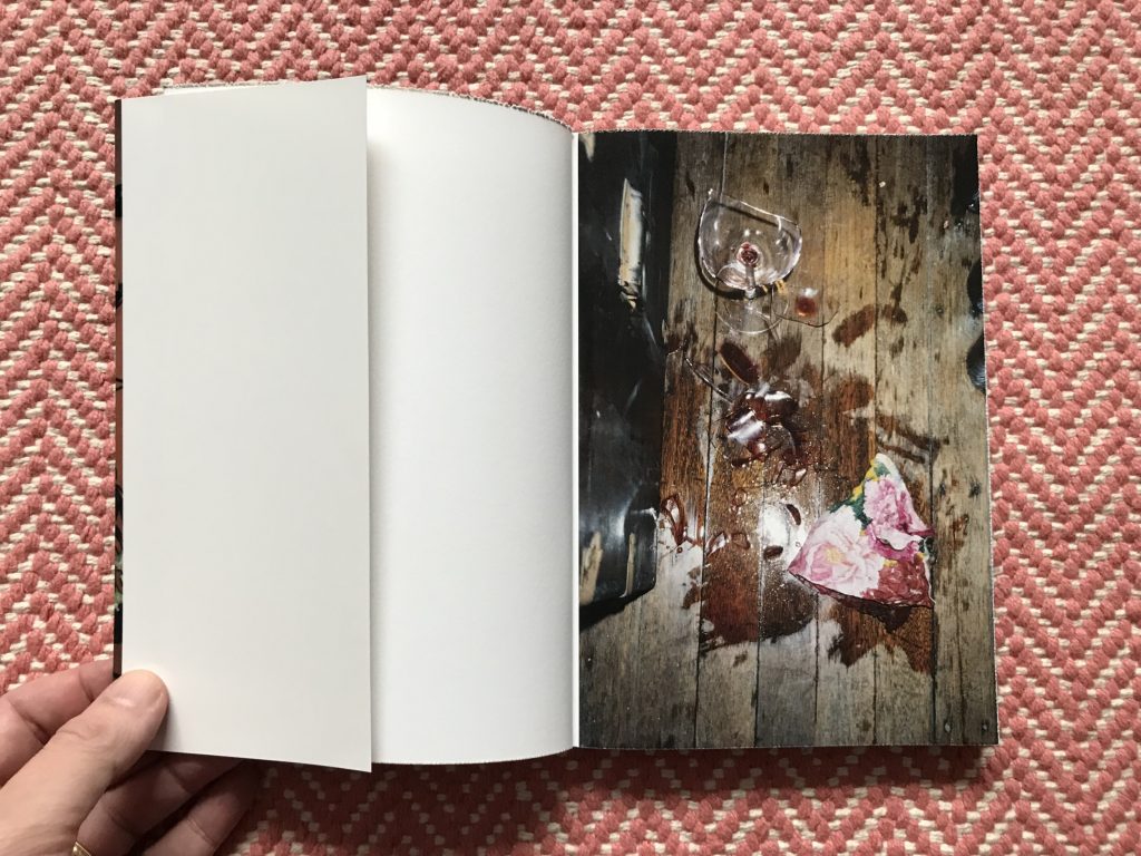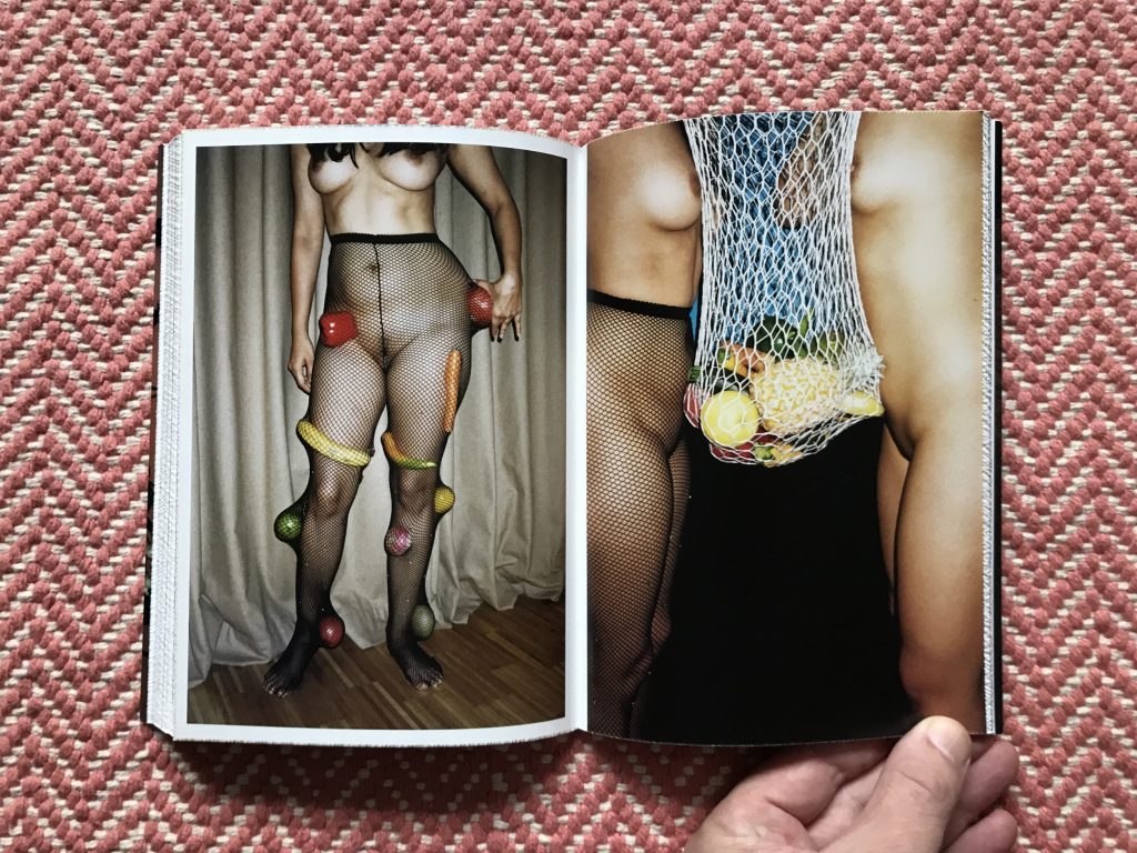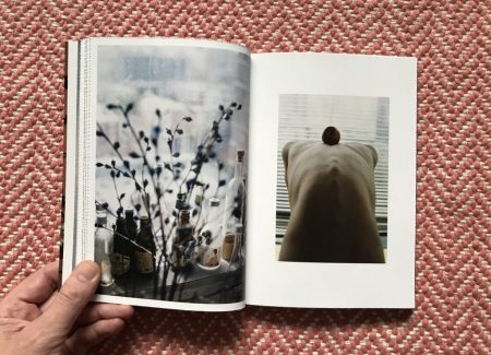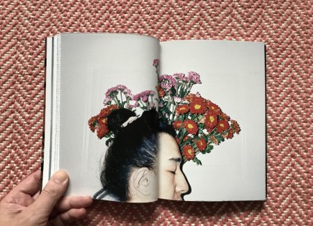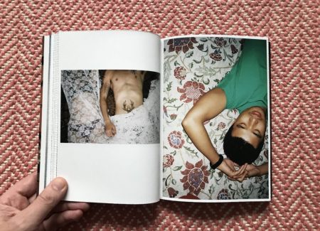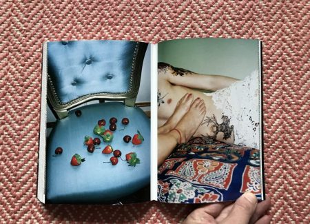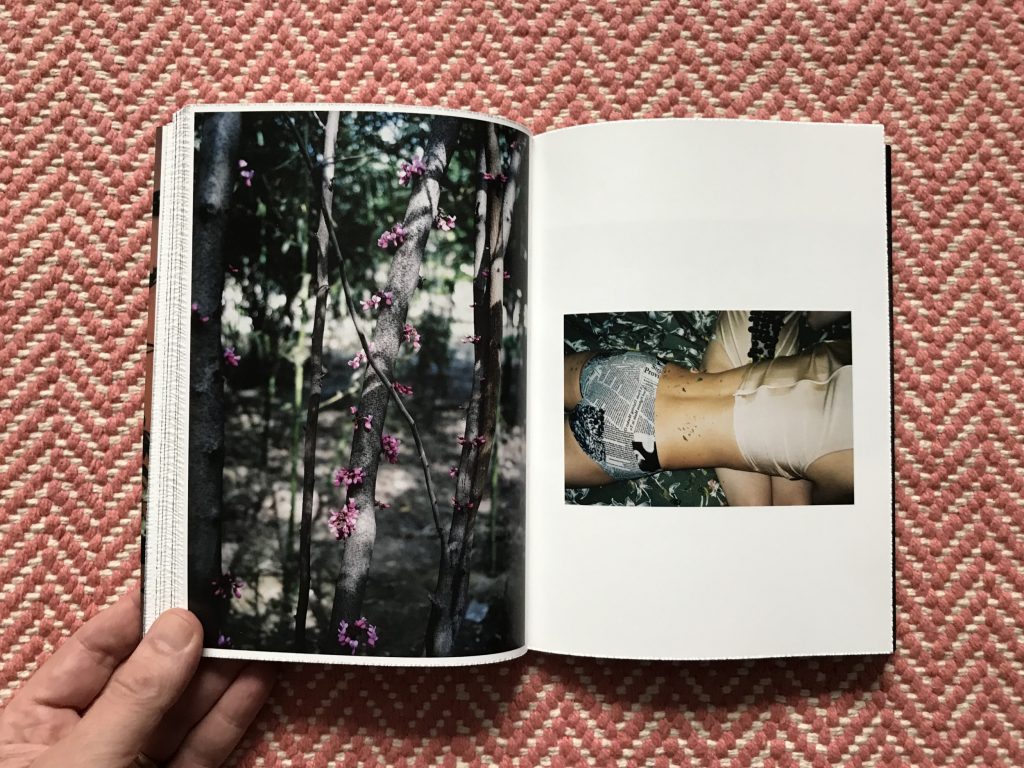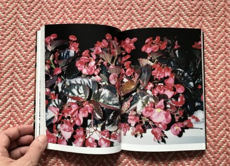 There are plenty of singular images worth finding in the pages of Flowers and Fruit. Misty smoke nestles in a bouquet of roses, cherries tumble from a wash of dark hair, legs tangle in a confusing mess around a black dress with holes, a man bends his foot toward a plant covered in light pink flowers, and a woman walks among a blizzard of white blossoms, each one a lovely self-contained meditation. The design of the photobook is simple, casual, and unobtrusive, its modest size making it easy to hold and contemplate. The images alternate between full bleed and bordered reproductions of various sizes, allowing interest to build through the page turns.