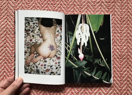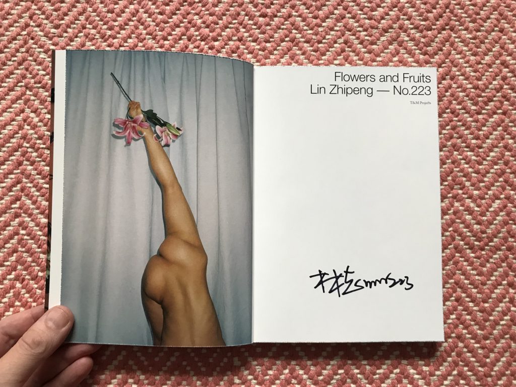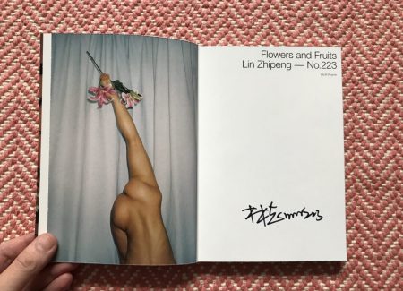 Flowers and Fruits is in many ways a literal title for Lin’s most recent photobook – every image in the collection has one or the other (or both) included as part of the setup. The definitions of “flowers” and “fruits” are relatively loose, taking in not only the obviously real and the fake as well as the cultivated and the wild, but also the motifs of flowers and fruits that find their way to bedspreads, carpets, curtains, and other decorative objects that are found in the various bedrooms and apartments that provide the setting and the colorful tattoos that decorate the skin of some of his subjects. Thematically, the flowers and fruits tie all the pictures into one integrated flow, bringing still lifes, nudes, and surreal visual concoctions into dialog with one another.